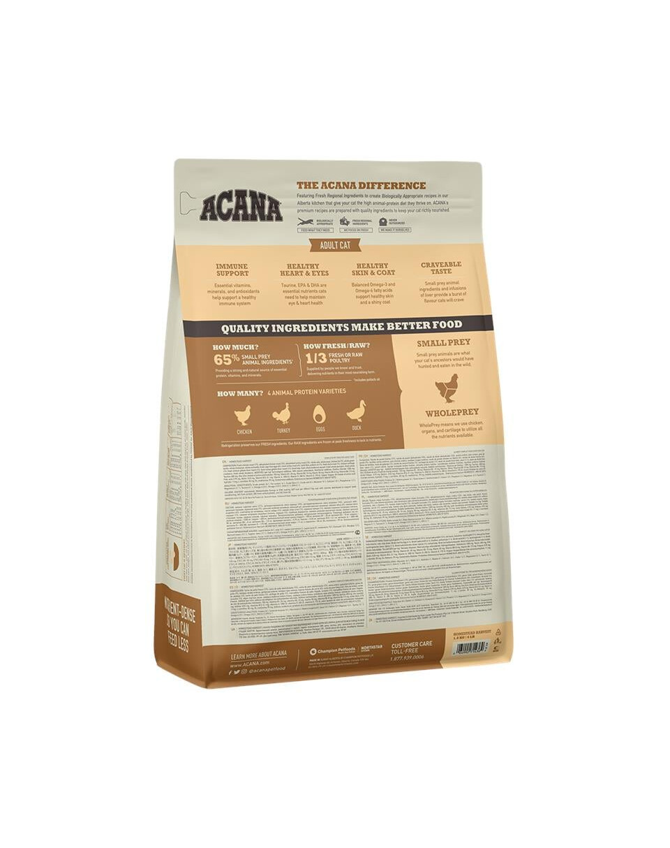 Acana Cat Homestead Harvest Katzenfutter ist unwiderstehlich und enthält nur natürliche, frische lokale Zutaten wie Freilandhuhn, Truthahn, Ente, Freilandeier und Fisch. Futter von Acana wird aus kleinen, natürlichen Beutetieren wie Freilandhühner, Wachteln und Enten hergestellt und ist daher reich an tierischem Eiweiß und anderen wichtigen, artgerechten Nährstoffen. Dadurch bekommt Ihre Katze ein Futter, das so gut wie möglich dem ursprünglichen Futter ihrer Vorfahren entspricht. Für die Rezeptur wurden neben Fleisch auch Innereien und Knochen verwendet, um alle essentiellen Nährstoffe bereitzustellen. Acana Katzenfutter enthält eine einzigartige Mischung aus wichtigen Vitaminen, Mineralien und Aminosäuren und unterstützt auf diese Weise die optimale Gesundheit Ihrer Katze.