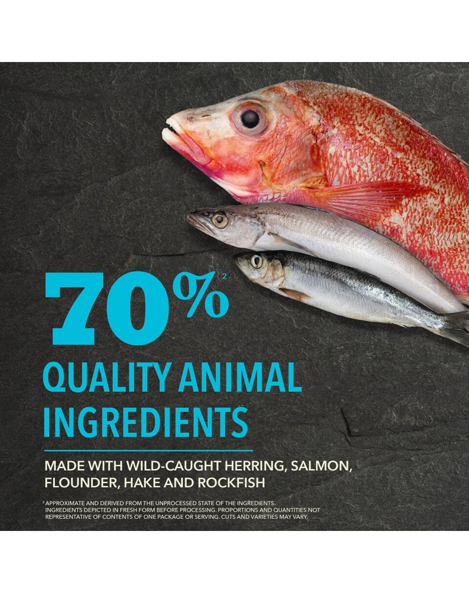 Frische Heringe (14%), frische Sardinen (12%), Heilbutt (8%), getrockneter Hering (8%), getrocknet cod (7%), getrockneter Weißfisch (7%), Erbsen, Linsen, Kichererbsen, grüne Linsen, Lachsöl (6%), frischer Silberhecht (4%), frischer Felsenbarsch (4%), gesprenkelte Bohnen, ganze gelbe Erbsen, sonnengereifte Alfalfa, Sonnenblumenöl, Linsenfasern, Braunalge, frischer Kürbis, frischer Butternusskürbis, frische Pastinaken, frischer Kohl, Spinat, frischer brauner Senf, frische Karotten, Red Delicious‘ Äpfel, frische „Bartlett“ - Birnen, gefriergetrockneter Kabeljau (0,1%), frische Preiselbeeren, frische Heidelbeeren, Chicorée-Wurzel, Kurkuma, Milch Distel Klette, große Wurzel, Lavendel, Eibisch, Hagebutten.