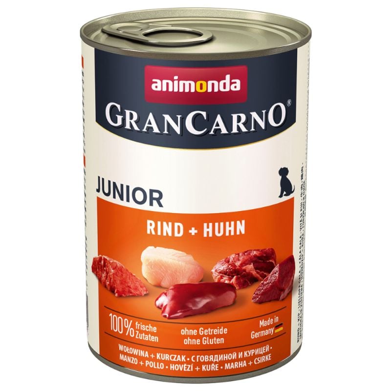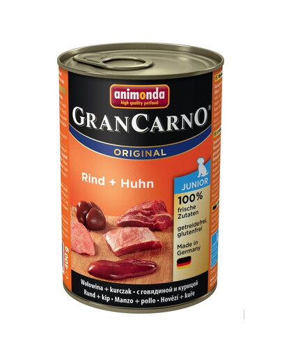 GranCarno Junior steht für ausgewogene, leckere gesunde Ernährung auf höchstem Niveau für wachsende Hunde im ersten Lebensjahr. Die ausgewählten, frischen fleischlichen Rohstoffe garantieren den unvergleichlichen Geschmack, den Hunde so sehr schätzen. GranCarno Junior - mit den welpengerechten, kleinen fleischigen Stücken ist speziell abgestimmt auf die Nährstoffansprüche wachsender, junger Hunde.
