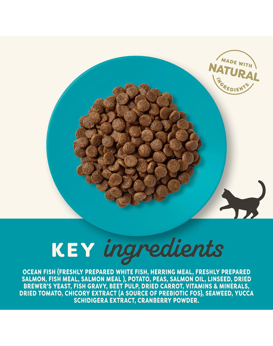 Die getreidefreie Rezeptur basiert auf nahrhaftem Fisch, hauptsächlich Cypriniden und Lachs. Die Gesamtmenge macht etwa 50 % der Zusammensetzung des Lebensmittels aus. Dadurch können Sie den Ernährungsbedürfnissen von Katzen gerecht werden und sie mit leicht verdaulichen ungesättigten Fettsäuren versorgen, die den Zustand von Haut und Fell Ihrer Katze verbessern.