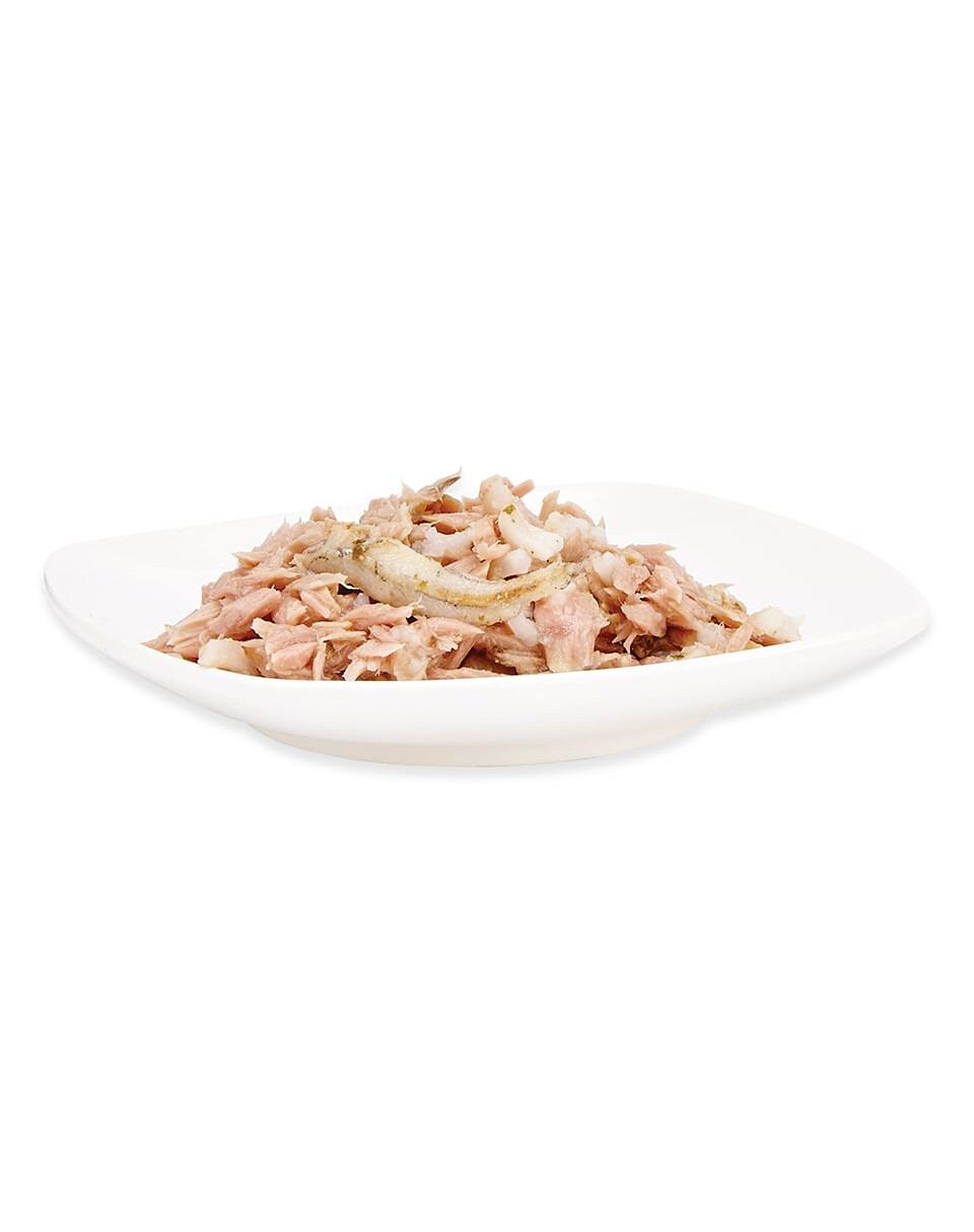 Frische Thunfischfilets (60%), Wasser (24%), Meeresalgen (10%), Sardellen (5%), Vollkornreis (1%)
