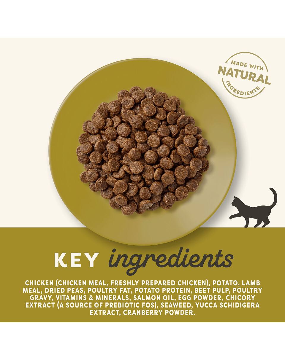 Enthält 80 % tierische Inhaltsstoffe. Die Formel basiert auf Huhn und Lamm. Katzen vertragen als Fleischfresser keine übermäßigen Mengen an Zusatzstoffen in ihrer Nahrung. Der Mangel an Getreide belastet das Verdauungssystem der Katze nicht zu sehr und das Futter wird vom Körper der Katze besser verwertet.