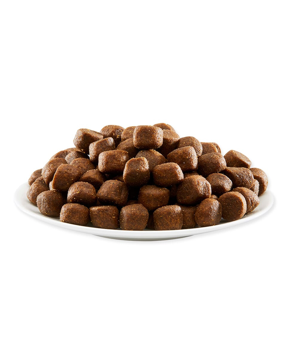 Zutaten: 66% Huhn, 8% Hühnchenhackfleisch, 6% Kartoffelstärke, 8% getrocknete Erbsen, 2,5% Geflügelöl (Omega-6-Fettsäuren), Rübenbrei, Geflügelsoße, Vollei (aus getrockneten Eiern)