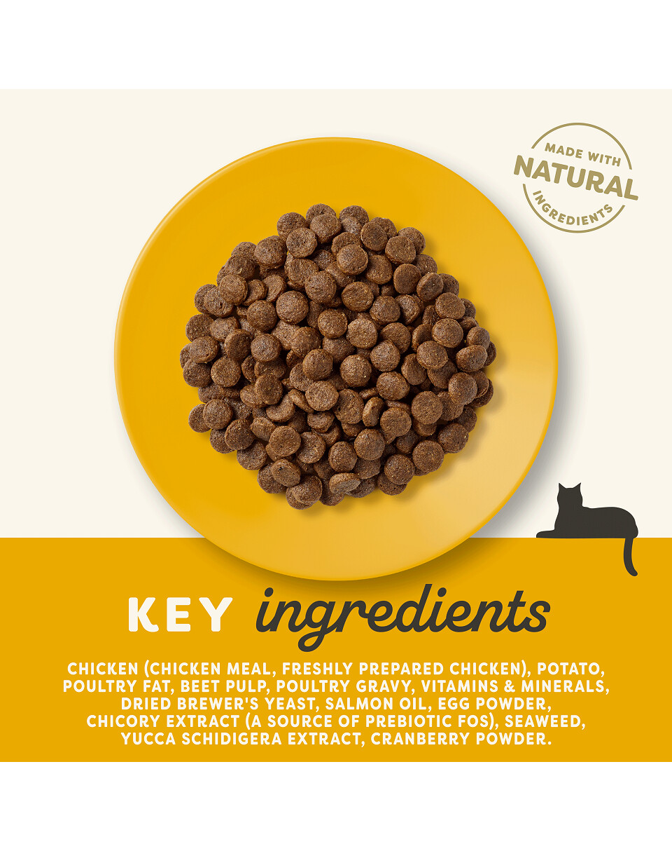 Hühnermehl (67 %), frisch gemahlenes Geflügelfleisch (12 %) (natürliche Quelle für Glucosamin und Chondroitin), Kartoffeln, Rübenschnitzel, Bierhefe, Geflügelsauce (1 %), Zellulosefaser pflanzlichen Ursprungs (0,03 %), Lachs Öl, Kokosnussöl (eine natürliche Quelle mittelkettiger Fettsäuretriglyceride), Vitamine und Mineralien, getrocknete Eier, Natriumchlorid, Calciumcarbonat, Seetang, Preiselbeeren, DL-Methionin, Kaliumchlorid, Yucca-Extrakt, Zitrusfruchtextrakt, Rosmarinextrakt