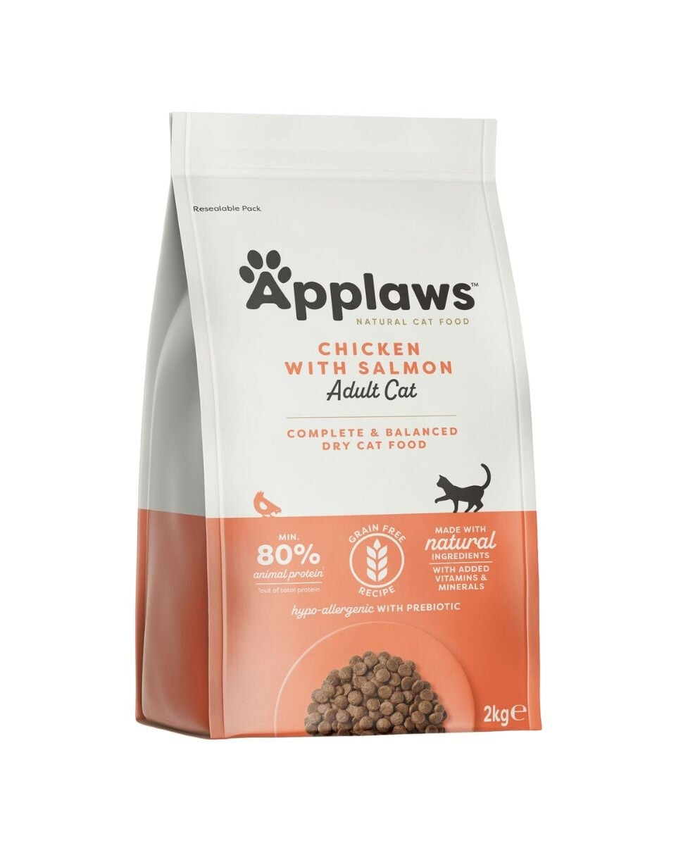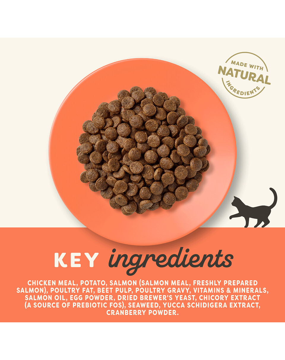 Enthält 84 % tierische Inhaltsstoffe. Die Formel basiert auf Huhn und Lachs. Katzen vertragen als Fleischfresser keine übermäßigen Mengen an Zusatzstoffen in ihrer Nahrung. Der Mangel an Getreide belastet das Verdauungssystem der Katze nicht zu sehr und das Futter wird vom Körper der Katze besser verwertet.