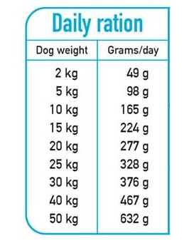 VERWENDUNG: Halbfeuchtes Hundefutter, geeignet für alle Hunderassen. Auf der Rückseite der Packung befindet sich eine Tabelle mit den empfohlenen Tagesdosen (die angegebenen Mengen sind Richtwerte). Die Menge des Futters kann je nach Aktivität, Hunderasse und Umgebungsbedingungen variieren. Hunde sollten immer sauberes und frisches Wasser zur Verfügung haben. Bewahren Sie den Behälter fest verschlossen an einem kühlen, trockenen und gut belüfteten Ort auf, geschützt vor Licht und Sonnenlicht.