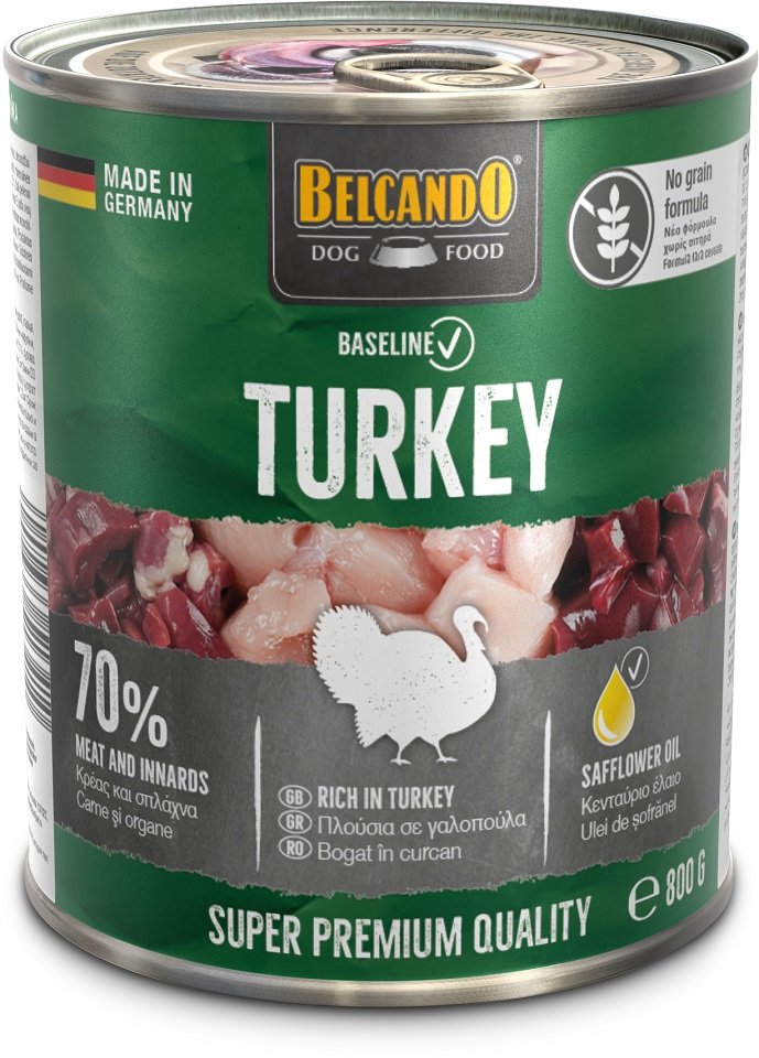Putenfleisch, Leber, Herz, Magen (26 %); Fleischbrühe (28,8 %); Fleisch; Leber; Magen; Herz; Niere; Lunge; Getrocknete Eierschalen; Mineralstoffe; Distelöl (0,2 %)
