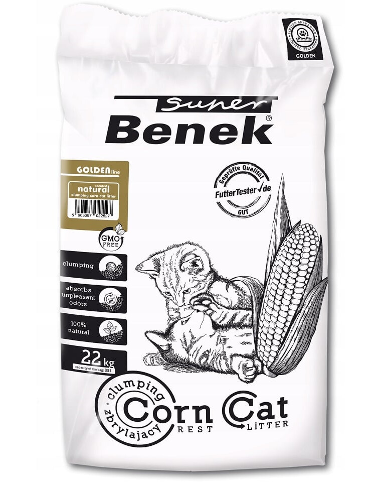 Benek Super Corn Cat Golden ist eine innovative Katzenstreu, die zu 100% aus natürlichem, pflanzlichem Material hergestellt wird. Dabei werden auch keine chemischen Zusätze verwendet, wodurch dieses Produkt kompostierbar und biologisch abbaubar ist und bequem über die Haustoilette entsorgt werden kann.