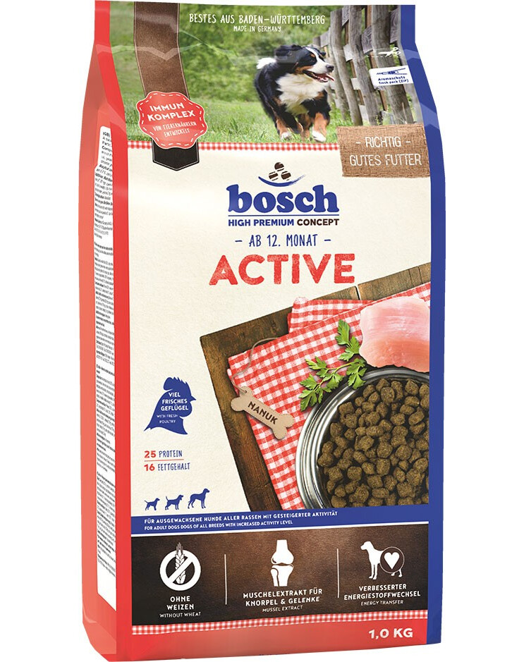 ACTIVE ist ideal für erwachsene Hunde mit erhöhtem Energiebedarf zur Unterstützung der optimalen Ausdauer und Leistungsfähigkeit (z. B. Hunde im Wach- & Schutzdienst, Sporthunde, usw.).