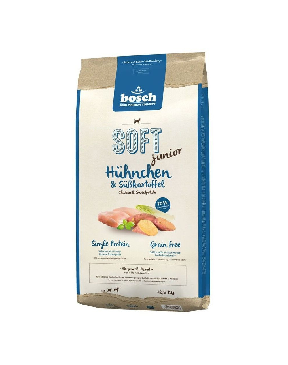 Bosch SOFT junior Hühnchen & Süßkartoffel ist ein Single Protein-Produkt für die ausgewogene und gesunde Ernährung wachsender Hunde aller Rassen. bosch SOFT junior Hühnchen & Süßkartoffel ist besonders für ernährungssensible Junghunde geeignet, die unter Futterunverträglichkeiten und Allergien leiden.