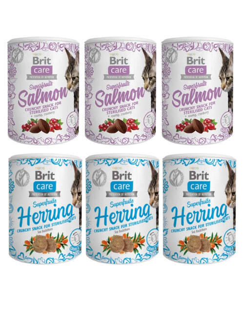 Ergänzungsfutter für kastrierte Katzen. Knusprige Snacks mit Hering und "SUPERFRUITS“ – mit Sanddorn. Raschelnde Knusper-Snack ziehen die Katze an und locken sie zum gemeinsamen Spiel.