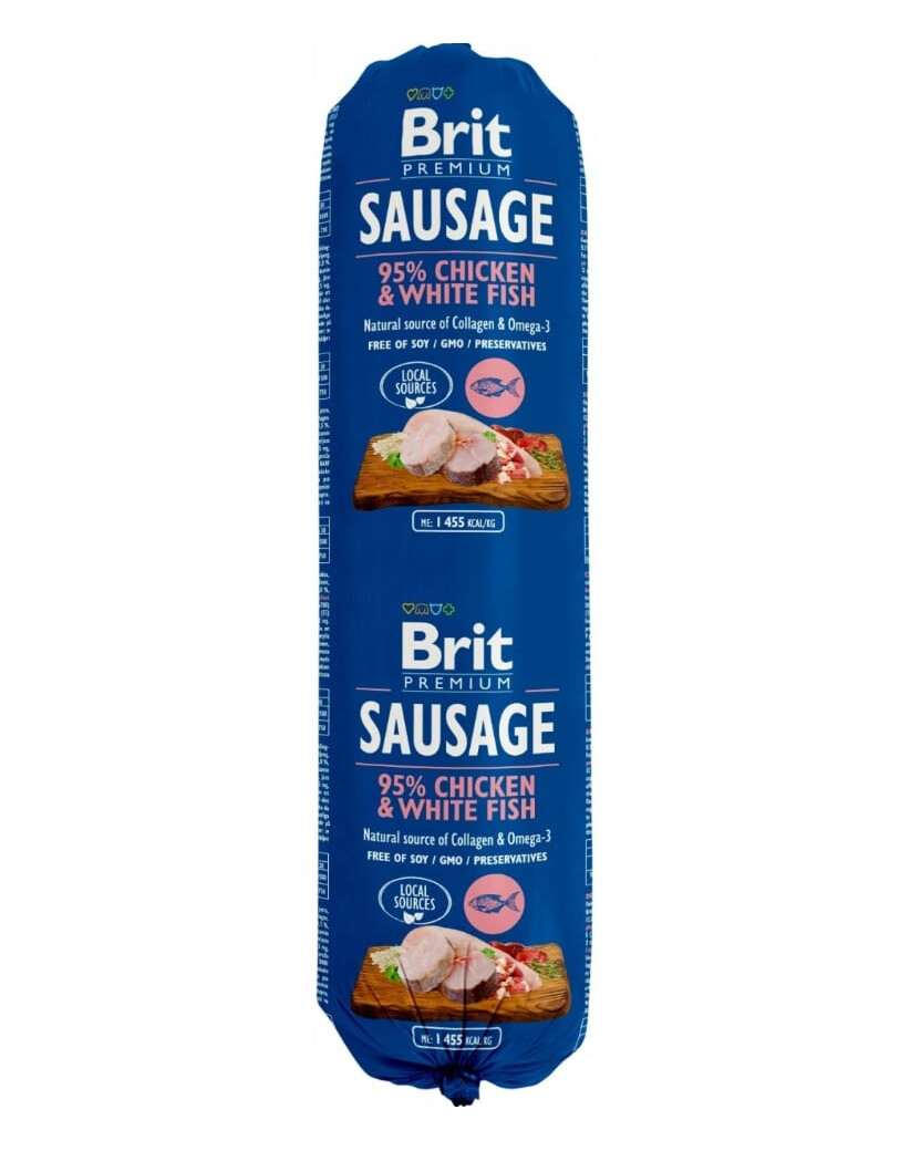 87 % Huhn (Hühnerfleisch, Leber, Herzen, Hälse, Mägen), 8 % weißer Fisch, 3,6 % Reis, 0,9 % Brühe, 0,5 % Kollagen.