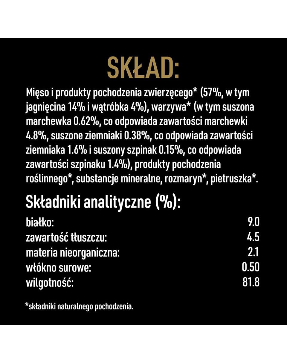 Fleisch und Erzeugnisse tierischen Ursprungs* (57%, davon Lamm 14% und Leber 4%), Gemüse* (davon getrocknete Möhren 0,62%, entsprechend einem Möhrenanteil von 4,8%, getrocknete Kartoffeln 0,38%, entsprechend einem Kartoffelanteil von 1,6% und getrockneter Spinat 0,15%, entsprechend einem Spinatanteil von 1,4%), Erzeugnisse pflanzlichen Ursprungs*, Mineralstoffe, Rosmarin*, Petersilie*.