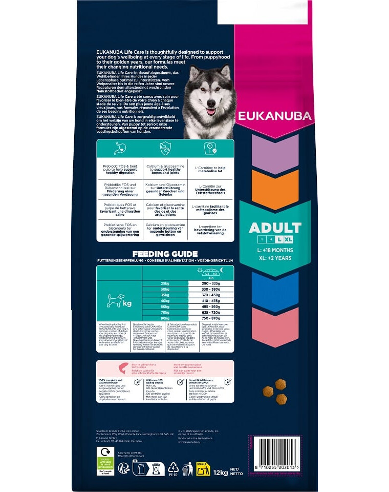 EUKANUBA Life Care ist eine Premium-Futterlinie, die auf wissenschaftlichen Erkenntnissen basiert und die Gesundheit des Hundes in jeder Lebensphase unterstützt. Dieses Futter wurde für erwachsene Hunde großer Rassen (ab 18 Monaten, für Riesenrassen ab 2 Jahren) entwickelt und bietet ihnen eine vollwertige und leicht verdauliche Ernährung. Die Kroketten, die reich an Lachs und Gerste sind, liefern leicht verdauliches Protein und Energie, um Aktivität und eine gesunde Kondition zu unterstützen.