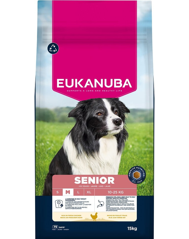 Das Trockenfutter EUKANUBA für ältere Hunde, reich an frischem Huhn, ist 100% vollständig und ausgewogen und ideal für Hunde mittelgroßer Rassen ab 10 Jahren.