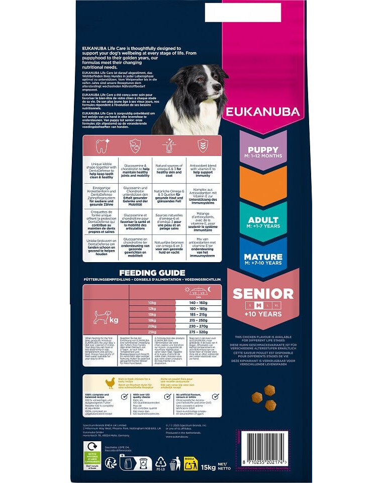 Ältere Hunde mittelgroßer Rassen benötigen eine Ernährung, die ihre Gesundheit und Vitalität jeden Tag unterstützt. EUKANUBA Life Care wurde von Experten mit Blick auf ihre Bedürfnisse entwickelt – die auf frischem Huhn basierende Formel liefert hochwertiges Protein, das die Muskelkraft erhält und Energie für die tägliche Aktivität bereitstellt.
