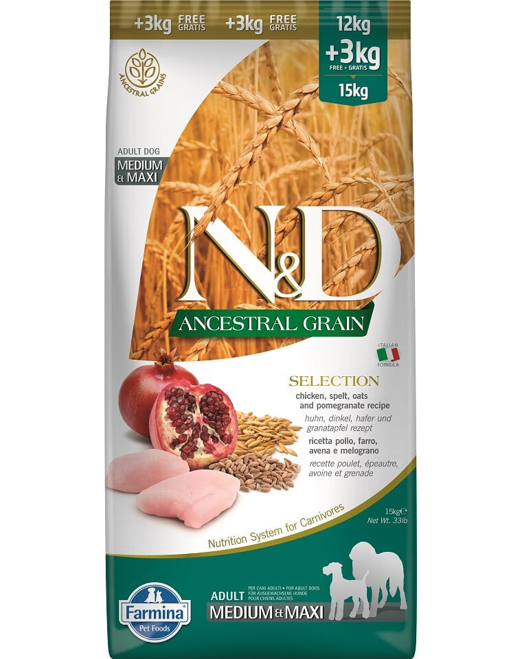 Das Rezept enthält einen geringen Anteil an Getreidekörnern - Hafer und Dinkel (jeweils 10 %). Die Hauptzutat ist frisches und getrocknetes Hühnerfleisch sowie Heringsfleisch. Alles zusammen sorgt für einen hohen Gehalt an tierischem Eiweiß, das eine gute Muskelmasse und eine gute Körperkondition unterstützt. Ergänzt wird das Rezept durch Obst, Gemüse und Kräuter. Der Granatapfel ist eine Quelle zahlreicher Mineralien und Vitamine und liefert Antioxidantien, die dazu beitragen, den Alterungsprozess der Körperzellen zu verzögern.