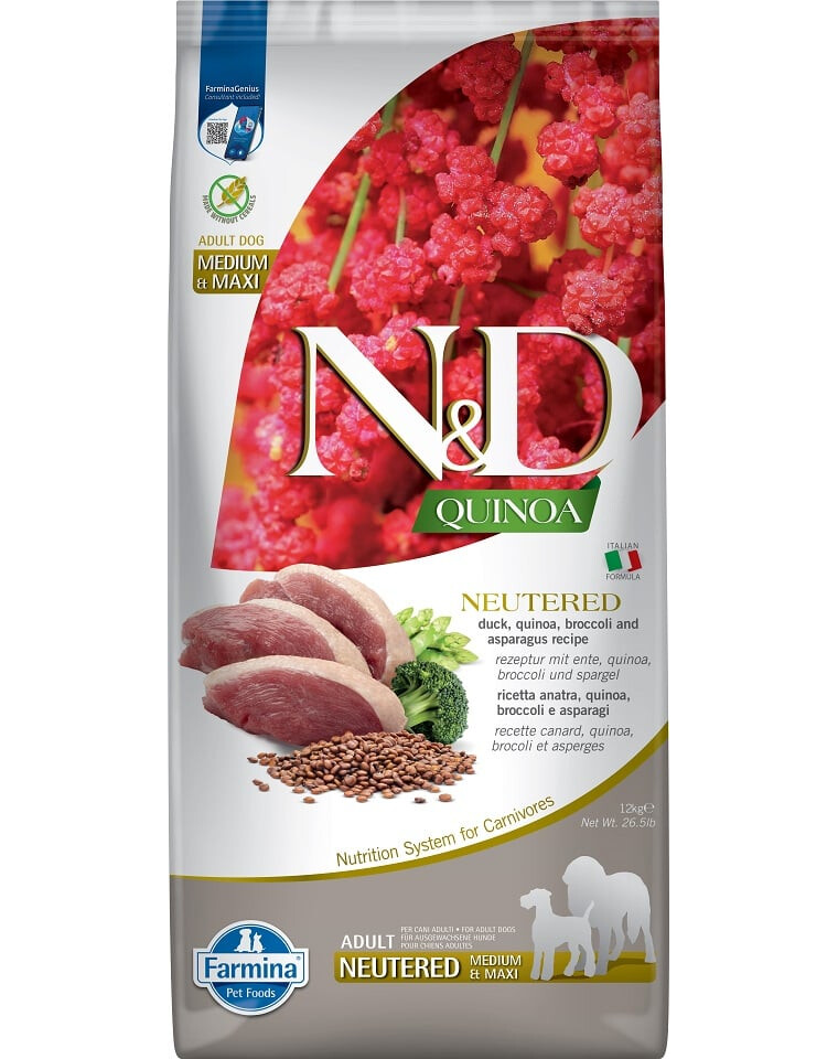 Die Rezeptur ist glutenfrei und basiert auf Ente, Quinoa und Gemüse. Quinoa fördert die Verdauung und Nährstoffaufnahme. Er ist eine Quelle für essenzielle Aminosäuren, Mineralien und Antioxidantien und trägt somit zur Vorbeugung von Herz-Kreislauf-Erkrankungen bei. Es handelt sich um ein glutenfreies Produkt mit einem niedrigen glykämischen Index. Ente ist eine hervorragende Quelle für tierisches Eiweiß. Das in der Rezeptur enthaltene Gemüse liefert die richtige Menge an Ballaststoffen, Nährstoffen, Vitaminen und Mineralien, um eine gute Kondition und Gewichtserhaltung nach der Kastration zu gewährleisten.