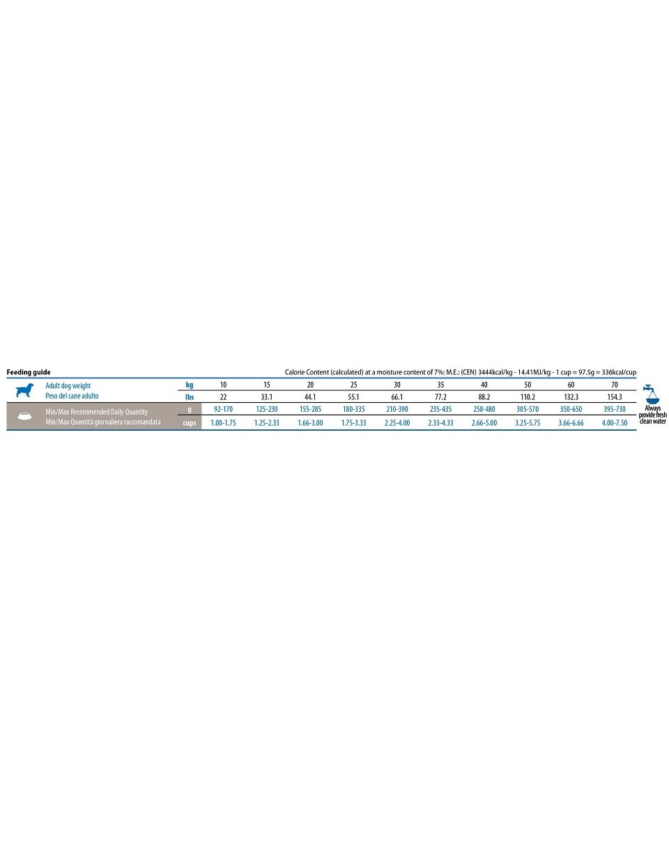 Rohprotein 30,00 %; Rohfett 11,00 %; Rohfaser 5,70 %; Luftfeuchtigkeit 9,00 %; Rohasche 7,80 %; Kalzium 1,20 %; Phosphor 0,90 %; Kalium 0,60 %; Natrium 0,35 %; Magnesium 0,10 %; Omega-6-Fettsäuren 2,00 %; Omega-3-Fettsäuren 0,30 %; DHA 0,10 %; EPA 0,05 %; Glucosamin 1200 mg/kg; Chondroitinsulfat 900 mg/kg.