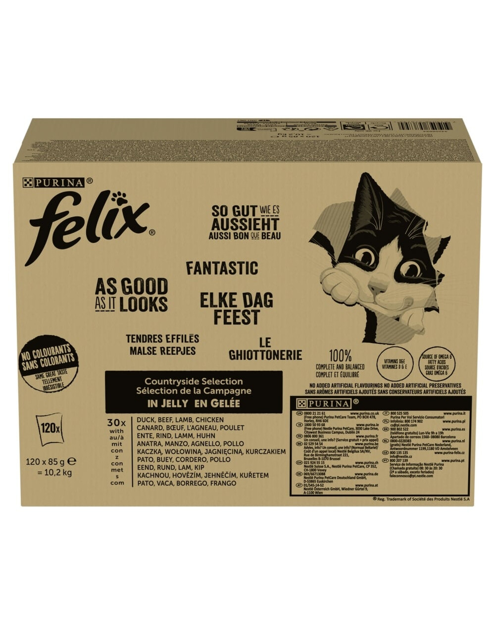 Felix Fantastic Wiejskie Smaki in Gelee Mix Fleisch ist ein vollwertiges Nassfutter für erwachsene Katzen, erhältlich in Varianten mit Rind, Huhn, Ente und Lamm.