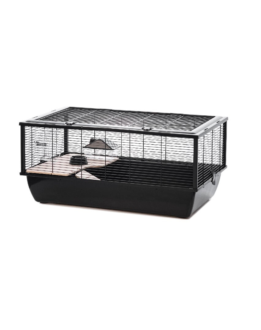 Käfig für Nagetiere. Gut geeignet für Tiere wie Hamster oder Meerschweinchen. Die Drähte bestehen aus ungiftigen Materialien und sind sicher für Tiere. Der Käfig umfasst Haspel, Schale und Haus. Kann von oben geöffnet werden.