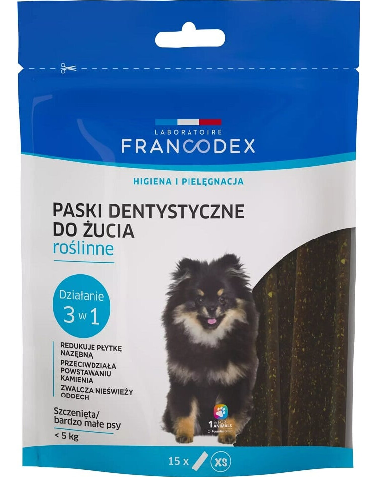 Die Gemüse-Kausticks von Laboratoire Francodex zur Entfernung von Zahnstein und Geruch im Maul wurden speziell für die kleinsten Hunderassen entwickelt. Die richtige Größe, die "Z"-Form und die abrasive, raue Oberfläche sorgen für eine effektive mechanische Reinigung der Zähne. Das in der Rezeptur enthaltene Granatapfelfruchtkonzentrat reduziert die Bildung von Plaque, die für den unangenehmen Geruch verantwortlich ist. Darüber hinaus hemmt die Kombination zweier Enzyme - Glucoseoxidase und Lactoperoxidase - das Wachstum von Mikroorganismen und reduziert so die Bildung von Zahnstein. Die pflanzliche Formel reduziert das Risiko von Nahrungsmittelallergien.