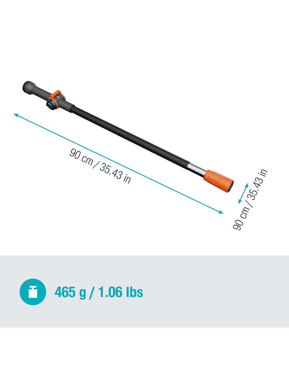 Der Stiel vergrößert den Arbeitsbereich um 90 cm. Dadurch wird die Reinigung von vertikalen Flächen wie Gartenzäunen, Gewächshäusern oder Garagentoren wesentlich einfacher. Der Stiel ist aus hochwertigem, langlebigem Aluminium gefertigt. Er ist leicht zu handhaben und leitet dank einer speziellen Beschichtung auch bei niedrigen Temperaturen keine Wärme.