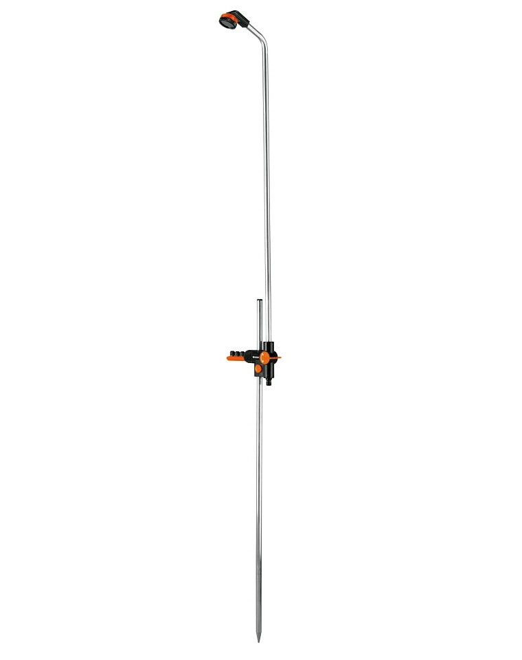 EineDusche im Freien kann ein äußerst angenehmes Erlebnis sein! Mit den Heringen lässt sich die GARDENA Gartendusche Duo einfach direkt auf dem Rasen oder im Gartenschirmständer platzieren. Die zwei Arten von Wasser in der Dusche - ein sanfter Strahl und ein weicher Nieselregen, der stufenlos eingestellt werden kann - sorgen für eine außergewöhnliche Erfrischung. Die stufenlose Höhenverstellung mit Druckknöpfen sorgt dafür, dass die Handbrause perfekt auf jede Höhe eingestellt werden kann. Wasserregler und Absperrventile ermöglichen die Regulierung des Wasserflusses.