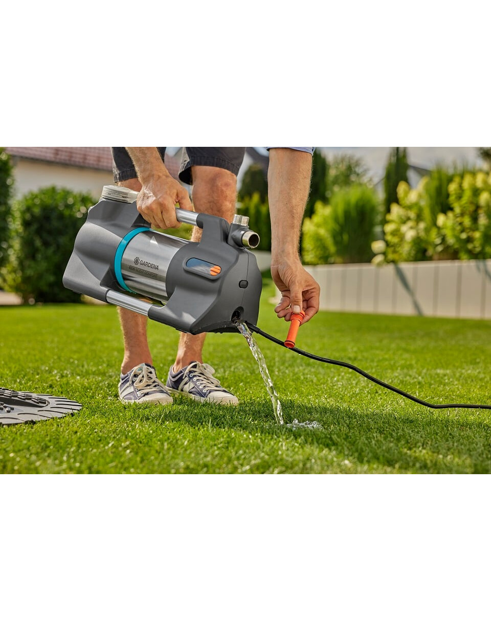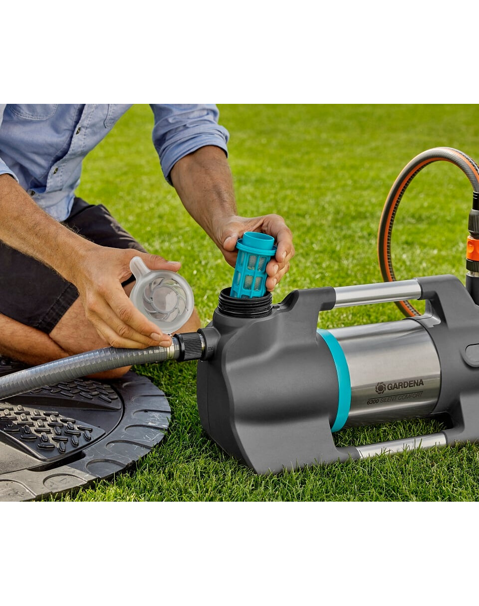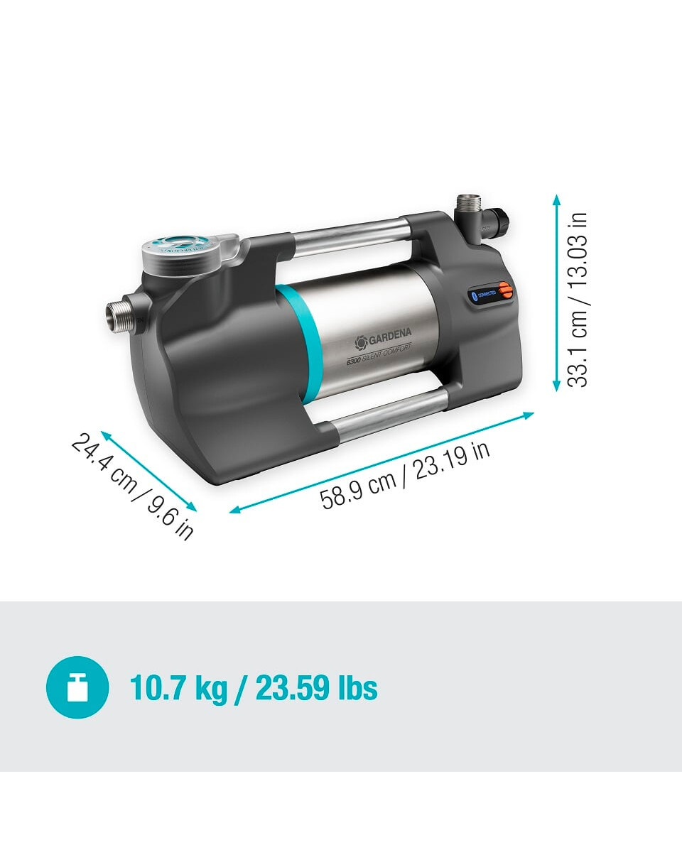 Die Gartenpumpe 6300 SilentComfort ist das Nonplusultra in Sachen Leistung. Die Pumpe besticht durch ihre Energieeffizienz und ihren extrem niedrigen Geräuschpegel. Dank ihres hocheffizienten Hydrauliksystems mit einem Energieverbrauch von nur 1050 W erreicht sie einen unglaublichen Wasserdurchfluss von bis zu 6300 l/h und eine Förderhöhe von 49 m (4,9 bar). Er kann zum Sammeln von Wasser aus Regentonnen, Brunnen oder Zisternen bis zu einer Tiefe von 8 m verwendet werden. Dank ihres innovativen mehrstufigen Betriebs und der Wasserkühlung ist die in Deutschland entwickelte SilentComfort-Pumpe mit einem Geräuschpegel von nur 45 dB (A) in 5 m Entfernung extrem leise im Betrieb. Diese Technologie kommt ohne Ventilator aus, da die Wärme über das Wasser abgeführt wird. Dies gewährleistet einen maximalen Wirkungsgrad und einen minimalen Geräuschpegel. Mit Ausnahme der Erstellung eines Bewässerungsplans können alle Funktionen über das hintergrundbeleuchtete LCD-Display des Geräts eingestellt werden, über das es auch ein- und ausgeschaltet werden kann. Diese Sperre verhindert, dass Kinder die Pumpe versehentlich in Betrieb nehmen. Dank der Bluetooth-Verbindung zu Ihrem Smartphone oder Tablet können Sie alle Funktionen aus der Ferne steuern und zusätzliche Funktionen aus einer Entfernung von 10 m nutzen. Außerdem können Sie Bewässerungszeitpläne und Timer einstellen und sich an anstehende Filterreinigungstermine erinnern lassen. Wenn Sie die Pumpe zum ersten Mal starten, helfen Ihnen detaillierte Anweisungen in der App, die Pumpe für den Betrieb vorzubereiten. Die Kombinationsmöglichkeit mit dem GARDENA Bodenfeuchtesensor (Art.-Nr. 1867-20) sorgt für eine optimale Bewässerung Ihrer Pflanzen ohne Wasserverschwendung. Die GARDENA 6300 SilentComfort Pumpe ist witterungsbeständig und kann daher die ganze Saison über im Freien stehen bleiben. Sie wird durch anhaltende Regenfälle oder hohe Luftfeuchtigkeit (z. B. Nebel) nicht beeinträchtigt. Das bedeutet, dass Sie sie näher an eine Wasserquelle stellen können. Die robusten Gummifüße sorgen für einen sicheren Stand. Der Trockenlaufschutz in Kombination mit dem Überhitzungsschutz und dem integrierten Vorfilter verhindert das Eindringen von Schmutzpartikeln in die Pumpe oder das Ausgabegerät und garantiert eine lange Lebensdauer. Durch die Verwendung von hochwertigen Materialien wie dem Edelstahlgehäuse und dem Aluminiumgriff ist die Druckpumpe sehr langlebig. Mit Behältern wie Brunnen und Regentonnen kann kostbares Frischwasser gespart werden. Das schont den Geldbeutel und die Umwelt, besonders in den trockenen Sommermonaten. Die Gartenpumpe verfügt über eine Keramikdichtung mit doppeltem Dichtungssystem und eine Edelstahlwelle zwischen Hydrauliksystem und Motor. Der Ansaugstutzen und die beiden Auslässe (einer davon ist um 180° drehbar) sind ebenfalls aus Edelstahl gefertigt. Es können mehrere Geräte gleichzeitig verwendet werden. Die große Einfüllöffnung und das Ablassventil erleichtern das Befüllen der Pumpe und bieten Schutz vor Einfrieren.