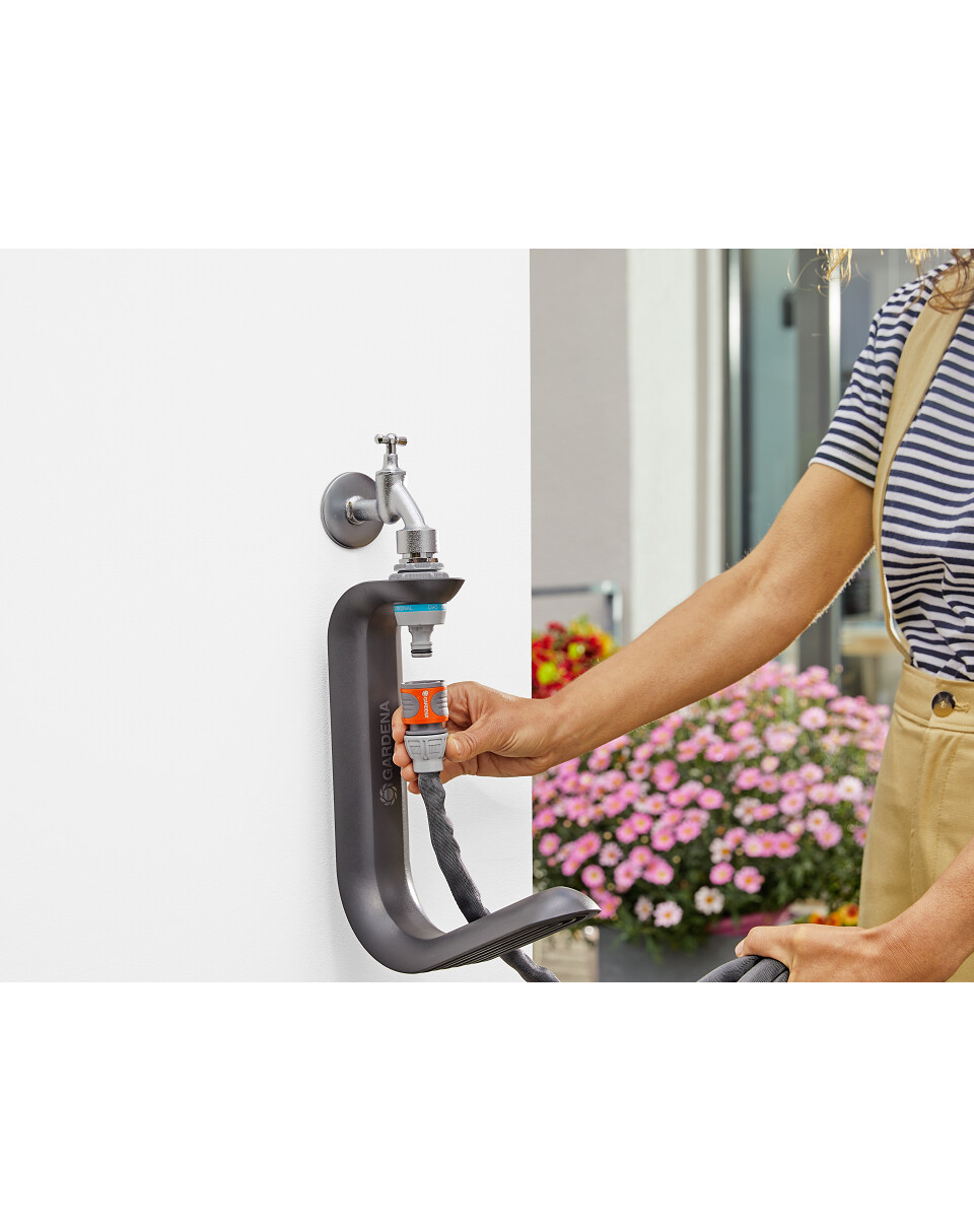 Der GARDENA Liano Schlauchaufhänger lässt sich schnell und einfach an fast allen Wasserhähnen (G 1", G 3/4" und G 1/2") ohne Bohren oder gar Werkzeug anbringen. Dank seines cleveren Designs kann der TapFix-Aufhänger ohne Bohrungen in der Wand angebracht werden - die Installation ist einfach und beschädigt die Wandstruktur nicht. Dieser Aufhängungstyp ist ideal für GARDENA Liano Textilschläuche und kann Schläuche mit einer Länge von bis zu 20 Metern aufnehmen. Der Abstand vom Wasserhahn zum Boden muss mindestens 50 cm betragen, denn TapFix Liano Schlauchaufhänger und Liano Textilschläuche können aufgrund ihrer UV- und frostbeständigen Eigenschaften das ganze Jahr über an Wasserhähnen gelagert werden.
