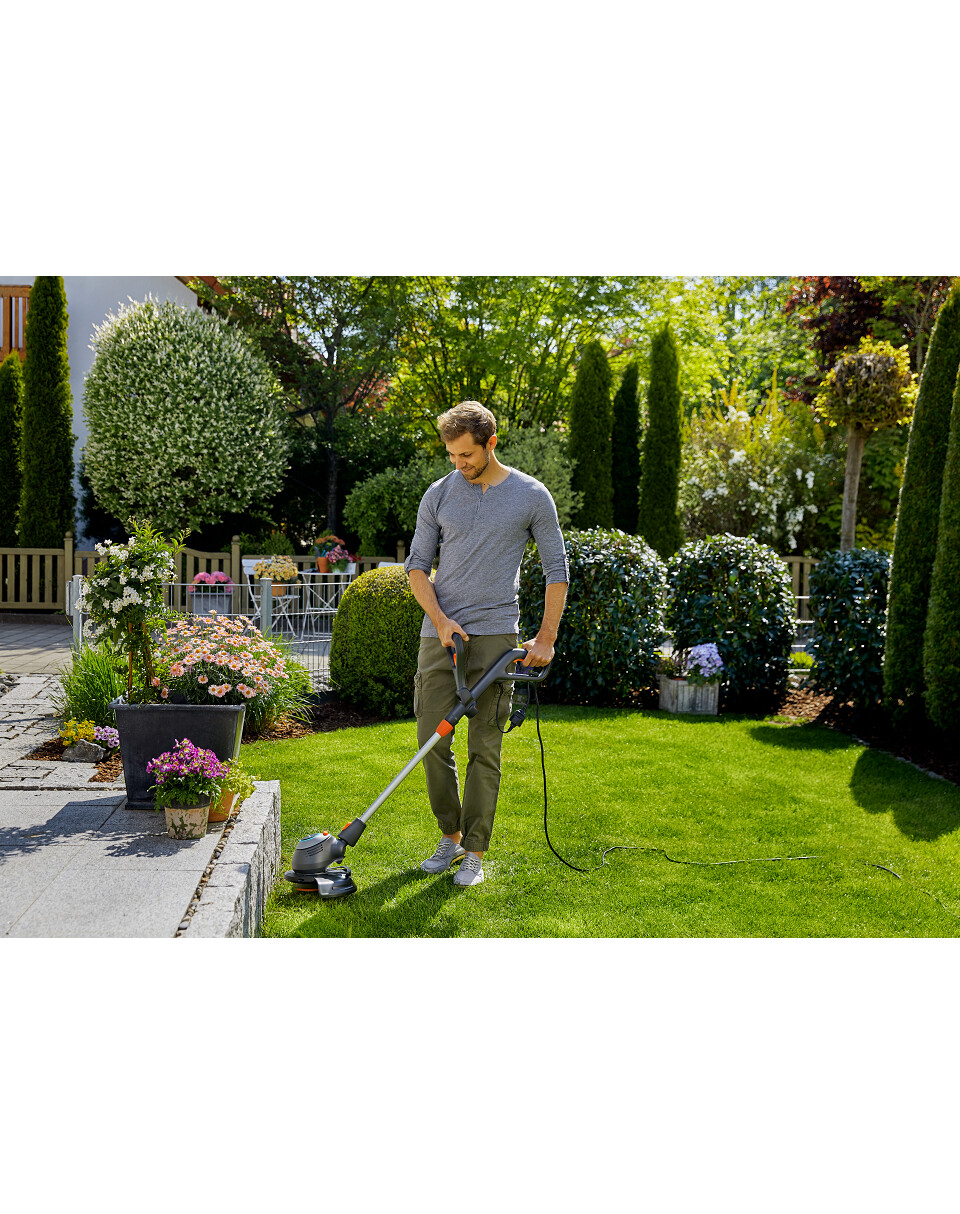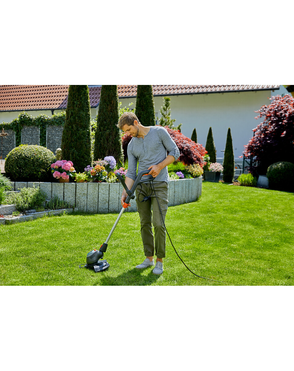 Der PowerCut 650/28 verfügt über viele Funktionen, die die Rasenpflege so einfach wie nie zuvor machen. Der extrem leistungsstarke 650-W-Motor kommt nicht nur mit Gras, auch mit dichtem Gras, sondern auch mit anderen Pflanzen zurecht. Der PowerCut 650/28 wiegt nur 3 kg, so dass Sie länger arbeiten können, ohne zu ermüden. Sie können den Trimmer vor Arbeitsbeginn ganz einfach nach Bedarf einstellen. Sowohl der obere Griff als auch der Teleskopstiel sind verstellbar, so dass der Benutzer in der für ihn bequemsten Position arbeiten kann. Sie können auch die Position des Kopfes ändern, um schwer zugängliche Stellen zu erreichen, z. B. unter einer Gartenbank. Darüber hinaus gibt es eine Kantenschneidfunktion! Sie ermöglicht es, den Kopf in einem 90-Grad-Winkel zu positionieren, um das Schneiden von Gras am Rande des Rasens zu erleichtern. Der Trimmer kann mit Führungsrädern (9880-20) ausgestattet werden, um das Trimmen der Rasenkanten zu erleichtern. Und schließlich muss man sich keine Sorgen um die Pflanzen machen, die auf dem Rasen wachsen, denn sie sind durch spezielle Abdeckungen geschützt. Die Abdeckung kann bei Bedarf abgenommen werden.