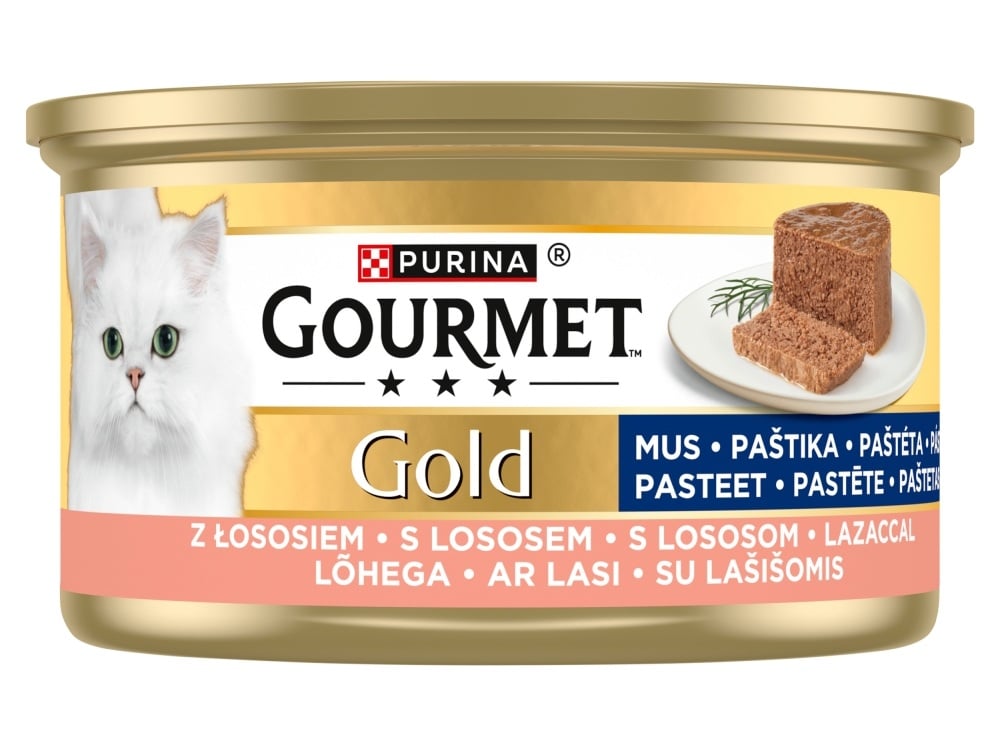 GOURMET Gold Mus mit Lachs ist ein vollwertiges Feuchtfutter für erwachsene Katzen, das sich durch die zarte Konsistenz des Mus und den raffinierten Geschmack von Lachs auszeichnet.