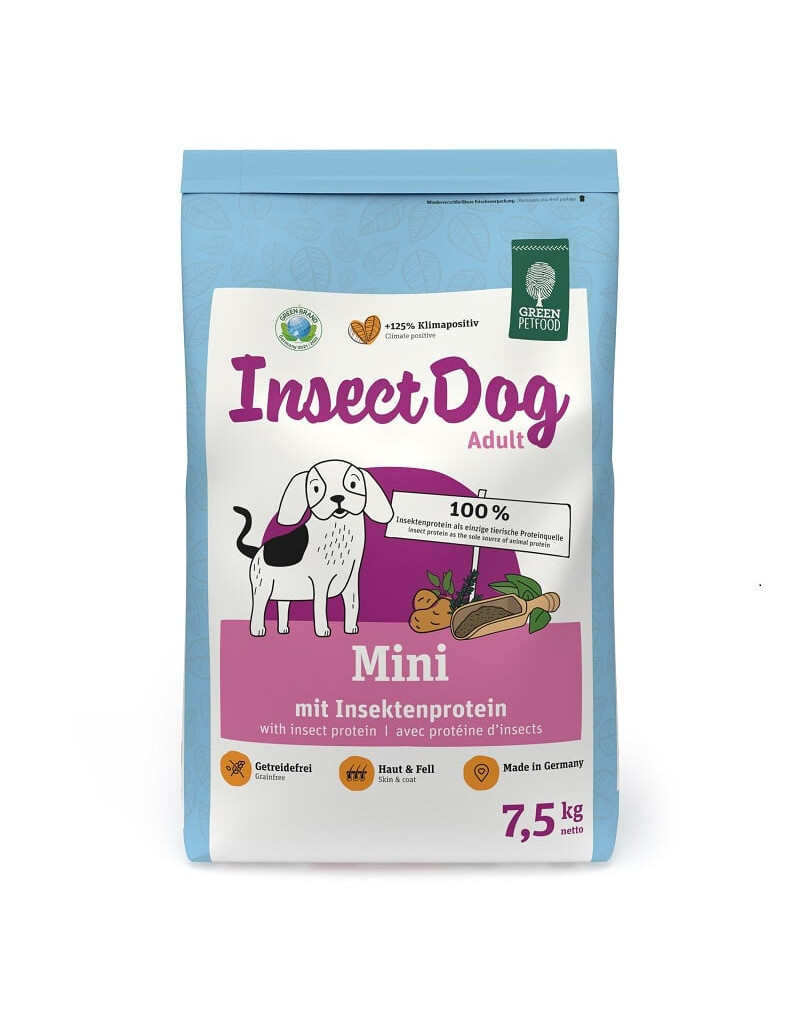 Green Petfood InsectDog Mini ist das beste Futter für kleine Hunde mit Nahrungsmittelunverträglichkeiten! Dank der leckeren Rezeptur mit Insektenprotein und Kräutern ist es sehr schmackhaft. InsectDog Monoprotein Hundefutter hat zudem eine hervorragende Akzeptanz, da es getreidefrei und leicht verdaulich ist.