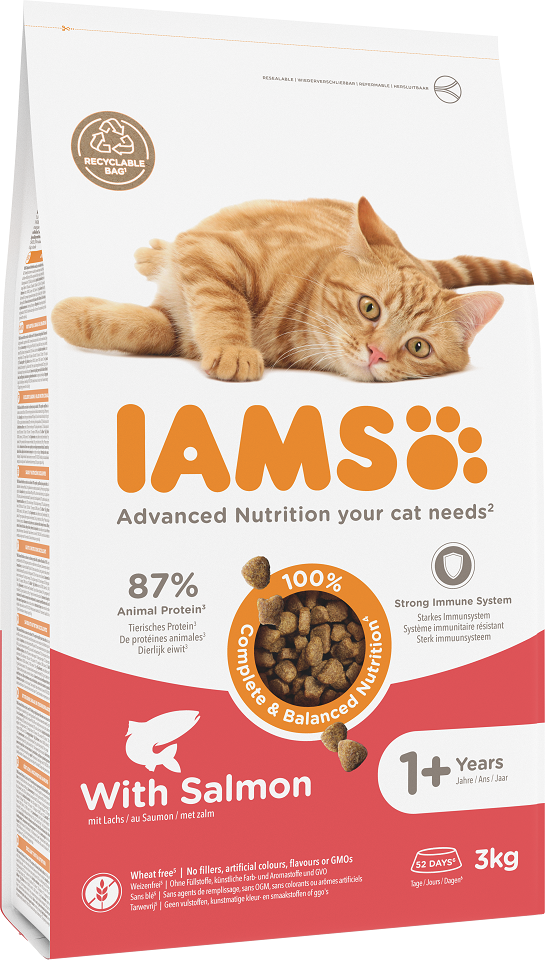 IAMS enthält Vitamin E zur Unterstützung des Immunsystems und Omega 6 und 3 Fettsäuren für ein gesundes und glänzendes Fell der Haut.