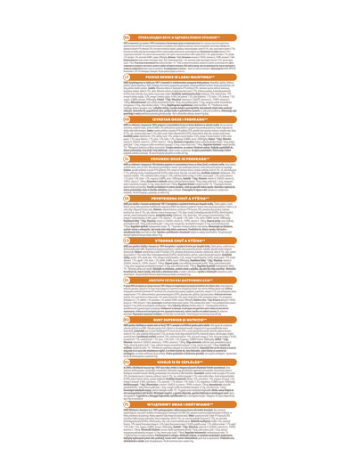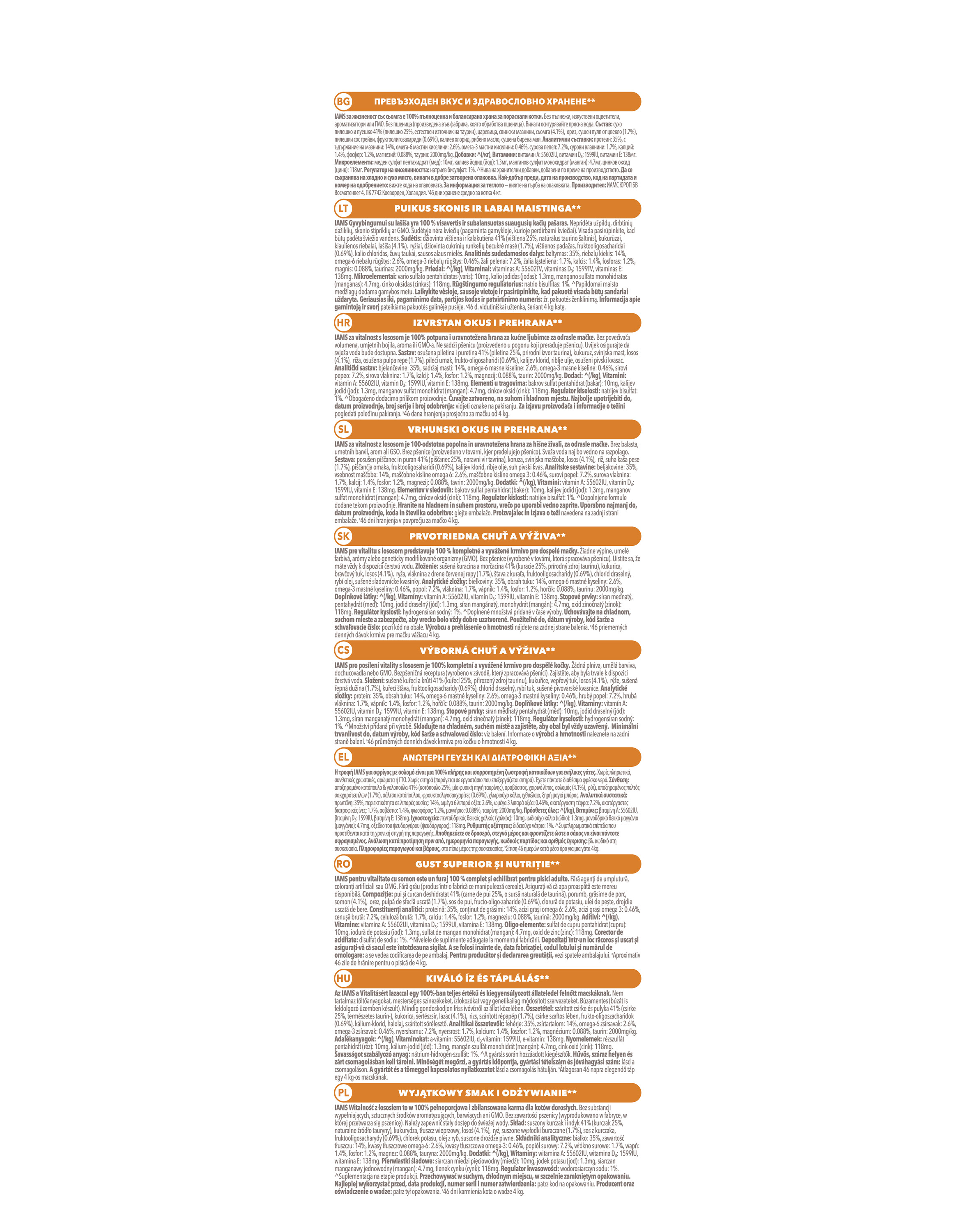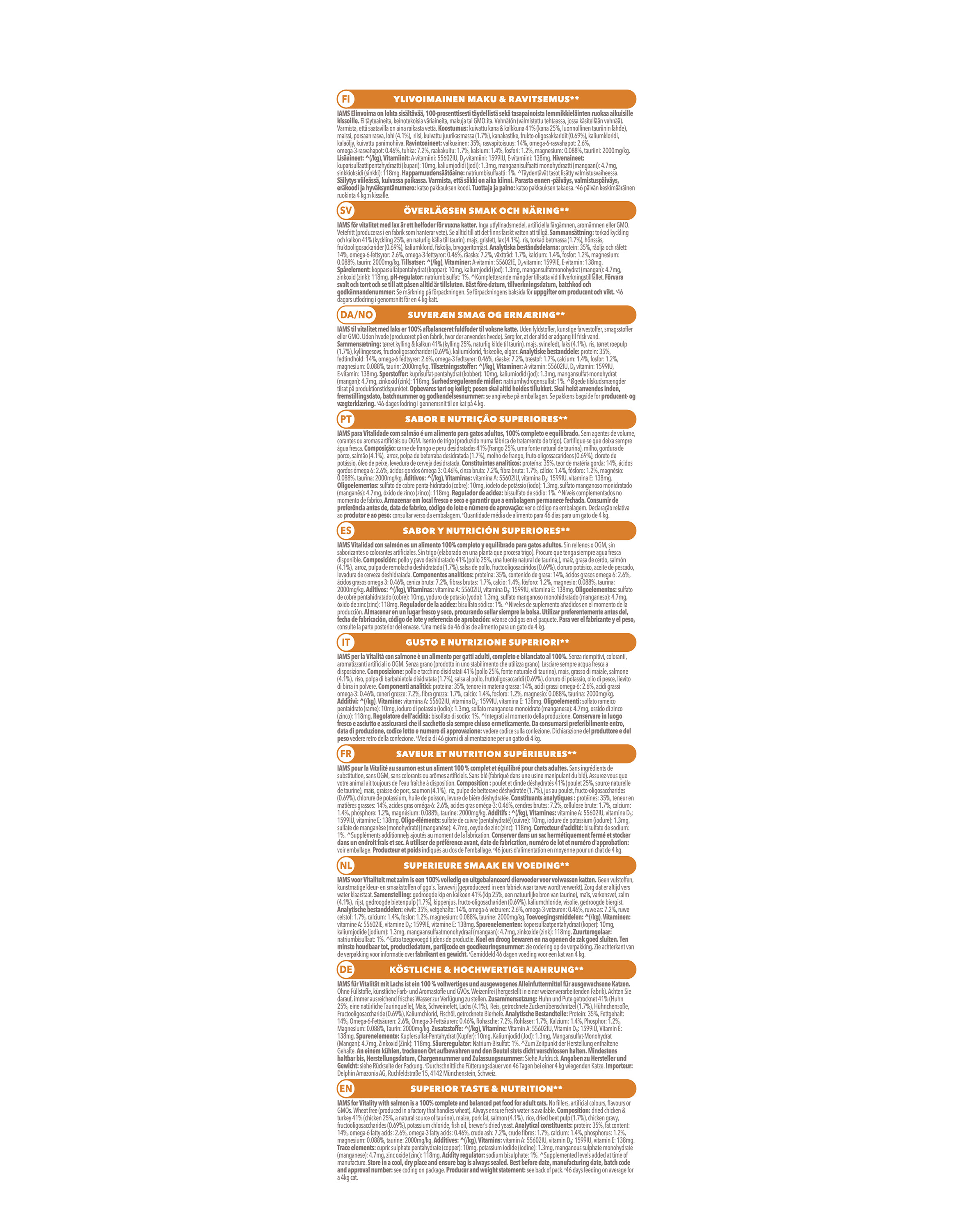 getrocknetes Huhn und Truthahn 40% (Huhn 24%, natürliche Taurinquelle), Mais, Schweinefett, Lachs (4,5%), Reis, getrocknete Rübenschnitzel (2%), Hühnersoße, Fructooligosaccharide (0,7%), Fischöl, Kaliumchlorid.