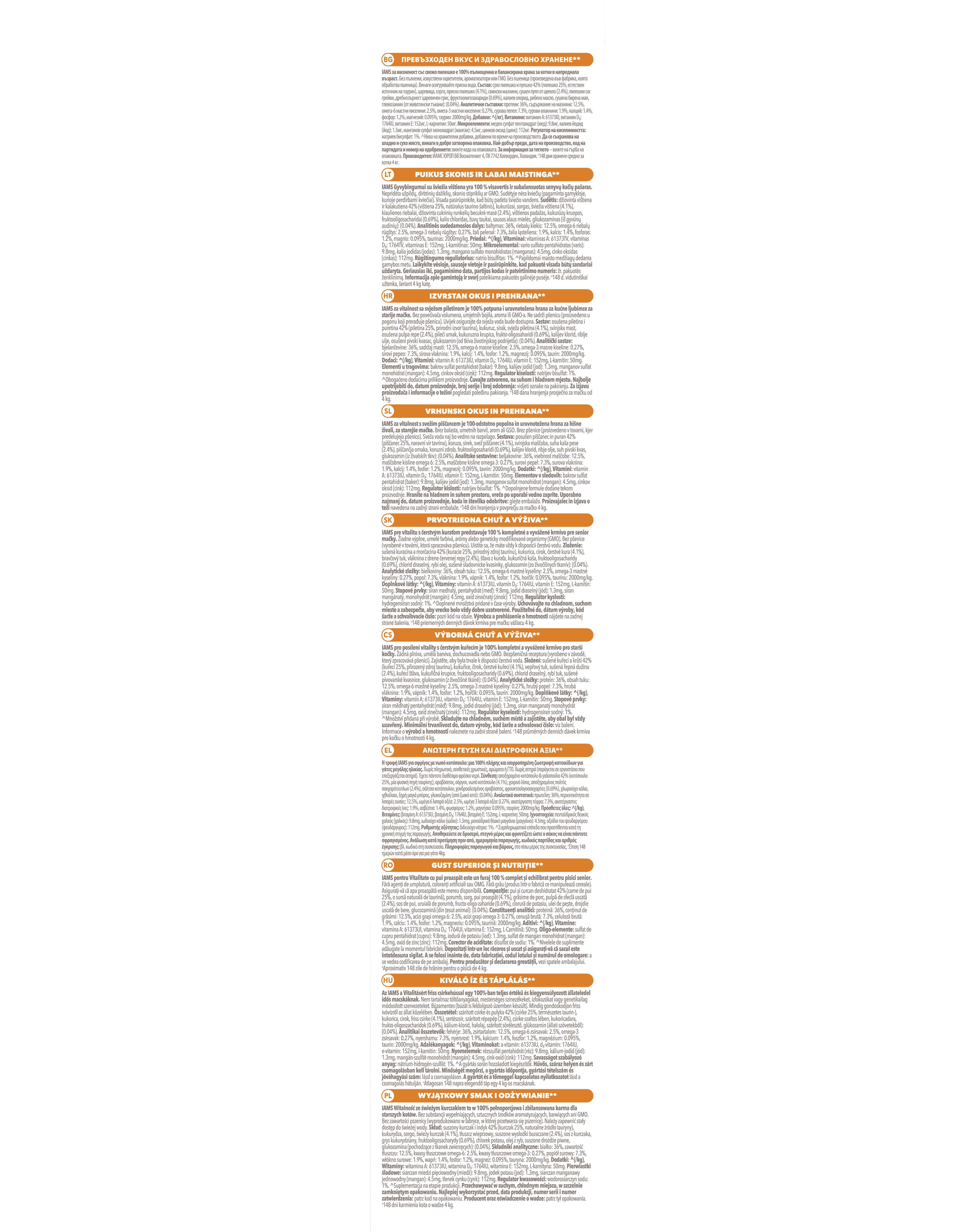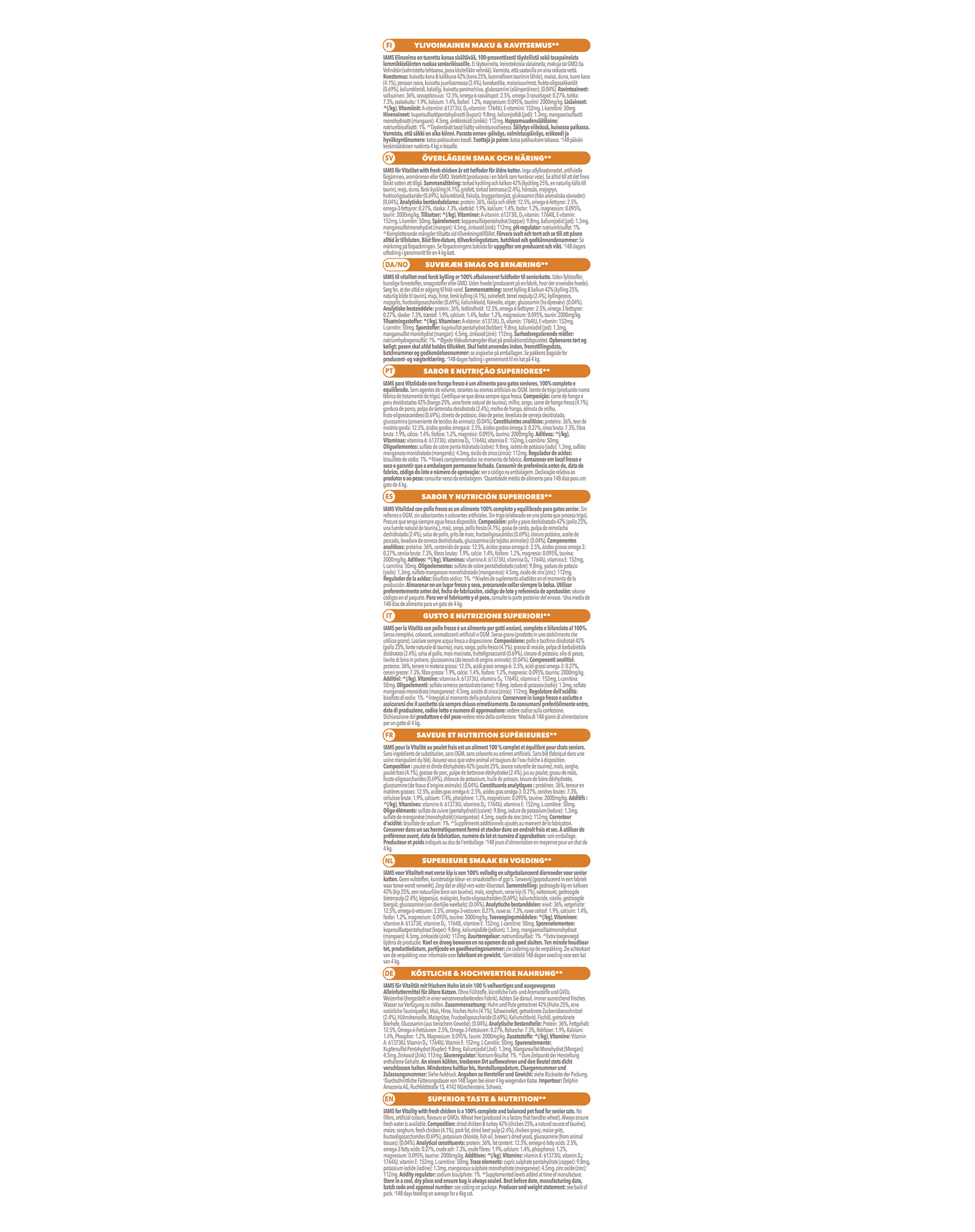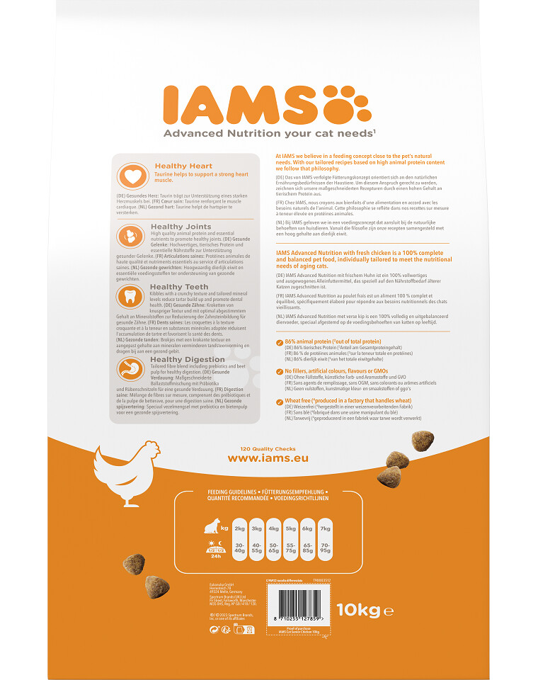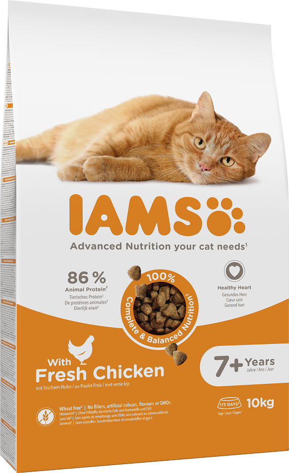 IAMS for Vitality ist ein 100 % vollwertiges und ausgewogenes Spezialfutter für ältere Katzen, das Ihrem Vierbeiner nicht nur hervorragend schmeckt, sondern ihn auch optimal gedeihen lässt. Unsere neue und verbesserte Rezeptur mit frischem Huhn für ältere Katzen schmeckt besonders lecker und basiert auf hochwertigen tierischen Proteinen, die sorgfältig ausgewählt wurden und die 7 Anzeichen gesunder Vitalität Ihres Vierbeiners begünstigen. Wir sind fest davon überzeugt, dass Katzen von Natur aus gesunde und aktive Tiere sind, die voller Vitalität stecken. Aus diesem Grund enthält unsere schmackhafte Rezeptur 88 % tierisches Protein (Anteil am Gesamtproteingehalt).