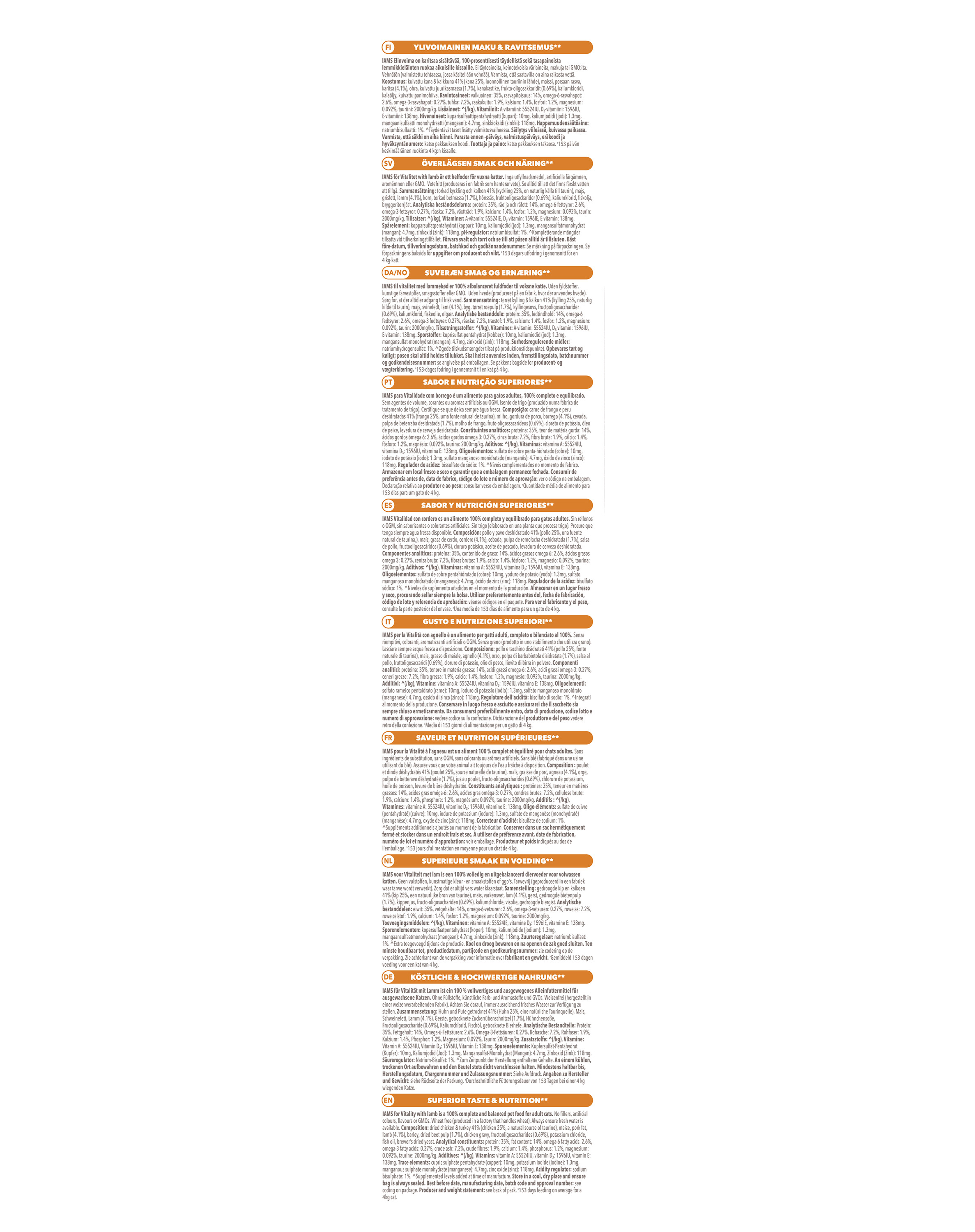 IAMS for Vitality ist reich an tierischem Eiweiß und bietet eine 100 % vollständige und ausgewogene Ernährung. Lammfleisch hat einen hohen Nährwert und ist ein leicht verdauliches Eiweiß, das den Körper mit allen essenziellen Aminosäuren versorgt. Das im Futter enthaltene Huhn ist eine Quelle von B-Vitaminen (Niacin, Riboflavin), die besonders wichtig für das Nervensystem der Katze sind. IAMS for Vitality ist reich an essentiellen Fettsäuren, die für das reibungslose Funktionieren des Herz-Kreislauf-Systems verantwortlich sind.