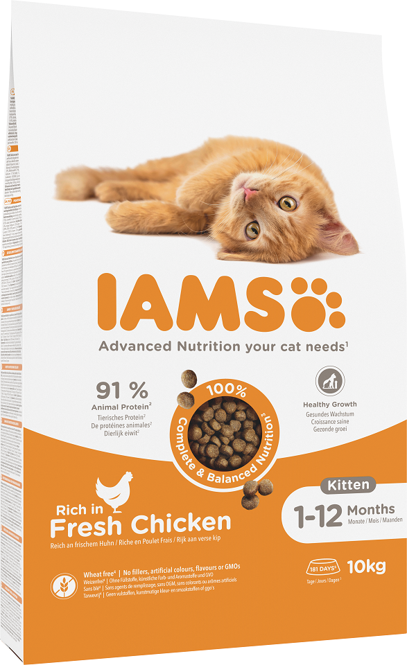 IAMS for Vitality für Kätzchen mit frischem Huhn ist ein 100% komplettes und ausgewogenes Futter. Die neue, schmackhafte und verbesserte Rezeptur enthält bis zu 91% tierisches Eiweiß (vom Gesamtproteingehalt) und alle Zutaten, die für ein wachsendes und sich entwickelndes Kätzchen notwendig sind. Das leckere Futter enthält keine unnötigen Zusatzstoffe, keine künstlichen Farb- oder Aromastoffe und keine GVOs. Darüber hinaus ist die neue Rezeptur weizenfrei*.
