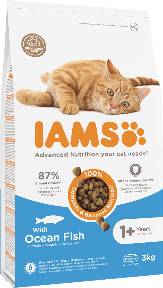 IAMS for Vitality ist reich an tierischem Eiweiß und bietet eine 100 % vollständige und ausgewogene Ernährung. Meeresfisch ist eine reichhaltige Quelle für mehrfach ungesättigte Omega-3-Fettsäuren, die für die richtige Entwicklung und Funktion des Nerven- und Immunsystems wichtig sind und eine gesunde Haut und ein glänzendes Fell fördern. Das im Fisch enthaltene Fett ist reich an Vitamin D und A, die für starke Knochen und gutes Sehvermögen bei Katzen verantwortlich sind. Ein wichtiger Inhaltsstoff von Fisch ist Jod, das den Stoffwechsel des Tieres beeinflusst und für ein normales Wachstum und die Funktion des Nervensystems sorgt.