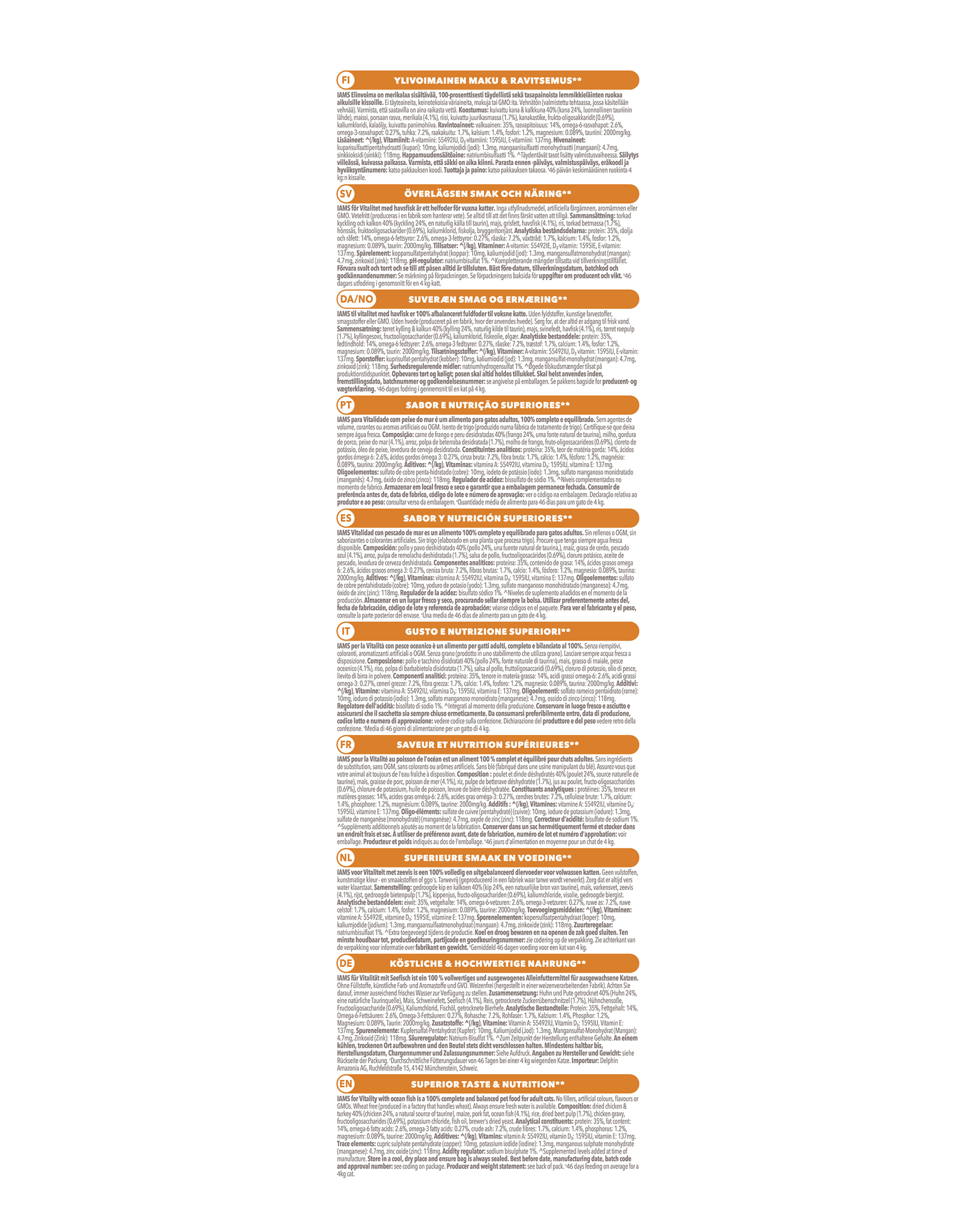 IAMS for Vitality ist reich an tierischem Eiweiß und bietet eine 100 % vollständige und ausgewogene Ernährung. Meeresfisch ist eine reichhaltige Quelle für mehrfach ungesättigte Omega-3-Fettsäuren, die für die richtige Entwicklung und Funktion des Nerven- und Immunsystems wichtig sind und eine gesunde Haut und ein glänzendes Fell fördern. Das im Fisch enthaltene Fett ist reich an Vitamin D und A, die für starke Knochen und gutes Sehvermögen bei Katzen verantwortlich sind. Ein wichtiger Inhaltsstoff von Fisch ist Jod, das den Stoffwechsel des Tieres beeinflusst und für ein normales Wachstum und die Funktion des Nervensystems sorgt.