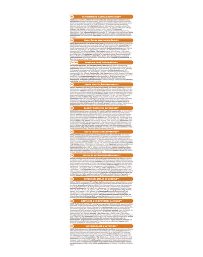 getrocknetes Huhn und Truthahn 40% (Huhn 24%, natürliche Taurinquelle), Mais, Schweinefett, Meeresfisch (4%), Reis, getrocknete Rübenschnitzel (1,9%), Hühnersoße, Fructooligosaccharide (0,7%), Fischöl, Kaliumchlorid.