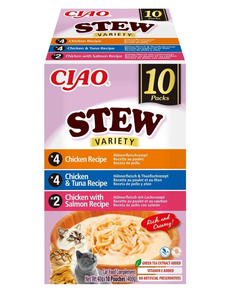 INABA Cat Ciao Stew Creamy Variety 10x40g mix przysmaków z kurczakiem, tuńczykiem i łososiem w kremowym sosie