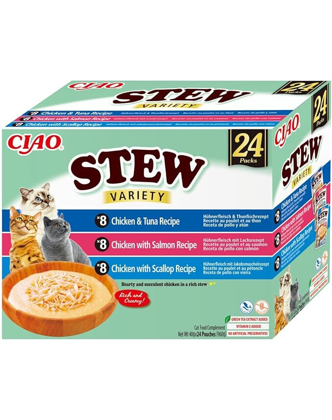 INABA Cat Ciao Stew Creamy Variety 24x40g mix przysmaków z kurczakiem, rybą i przegrzebkami w kremowym sosie