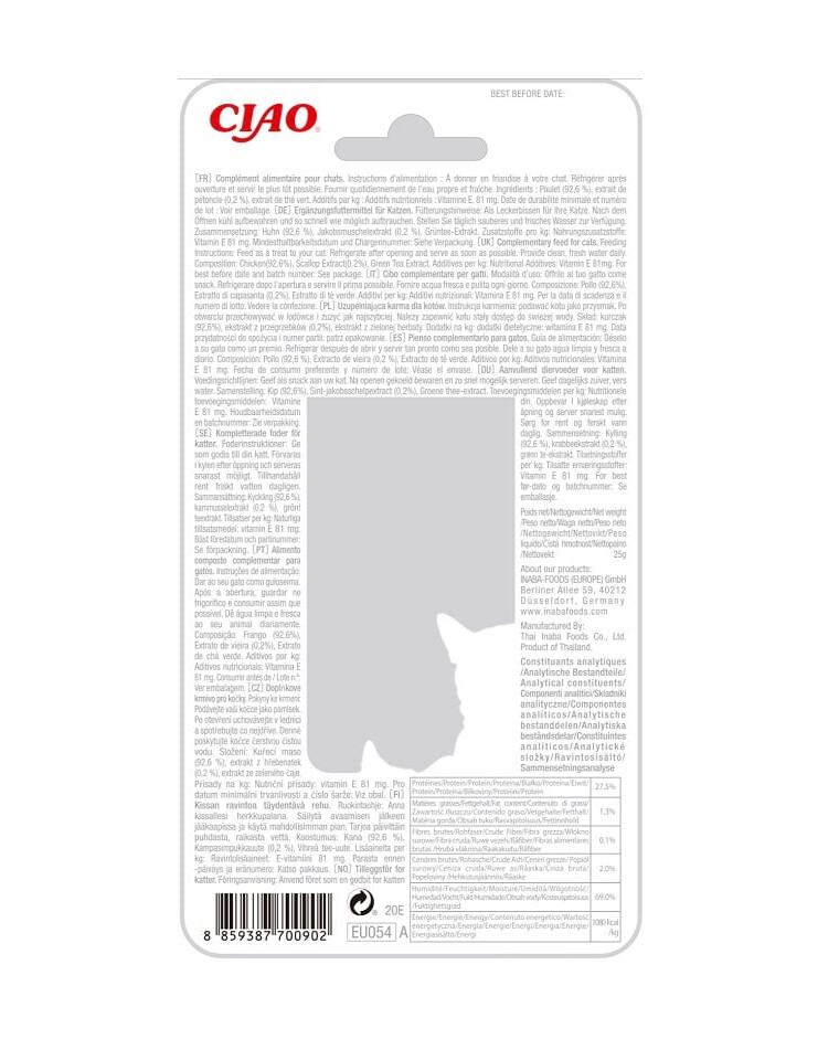 Chicken, Natural Scallop Flavored Broth, Salt, Sodium Phosphate, Vitamin E Supplement, Green Tea Extract.