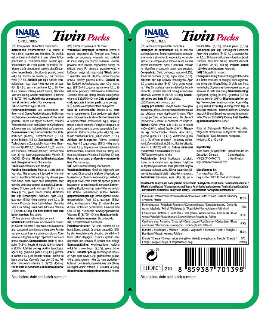 Zutaten: Hühnerbrühe, Huhn (44,9%), Karottenchips (2,6%), grüne Erbsen (2,6%). Zusatzstoffe pro 1 kg: Technologische Zusatzstoffe: Agar 4,0 g, Guarkernmehl (E412) 4,0 g, Xanthan 1,0 g, 2b natürliche, pflanzlich definierte Produkte, Camellia thea Link 30 mg. Sensorische Zusatzstoffe: Aromen. Diätetische Zusatzstoffe: Vitamin E (3a700) 404 mg.