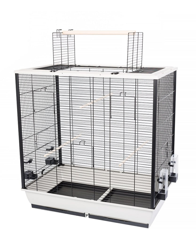 Vogelkäfig. Ausgestattet mit 4 großen Futterstellen und 4 Sitzstangen, die ein wesentlicher Bestandteil eines Vogelkäfigs sind. Sie dienen zum Ausruhen und Spielen und können auch einen Platz zum Anbringen von Spielzeug oder Vogelzubehör bieten. Ein Vorteil des Käfigs ist die tiefe Katzentoilette mit zwei Schubladen, die das Entsorgen von Abfällen und die Reinigung der Toilette erleichtert.