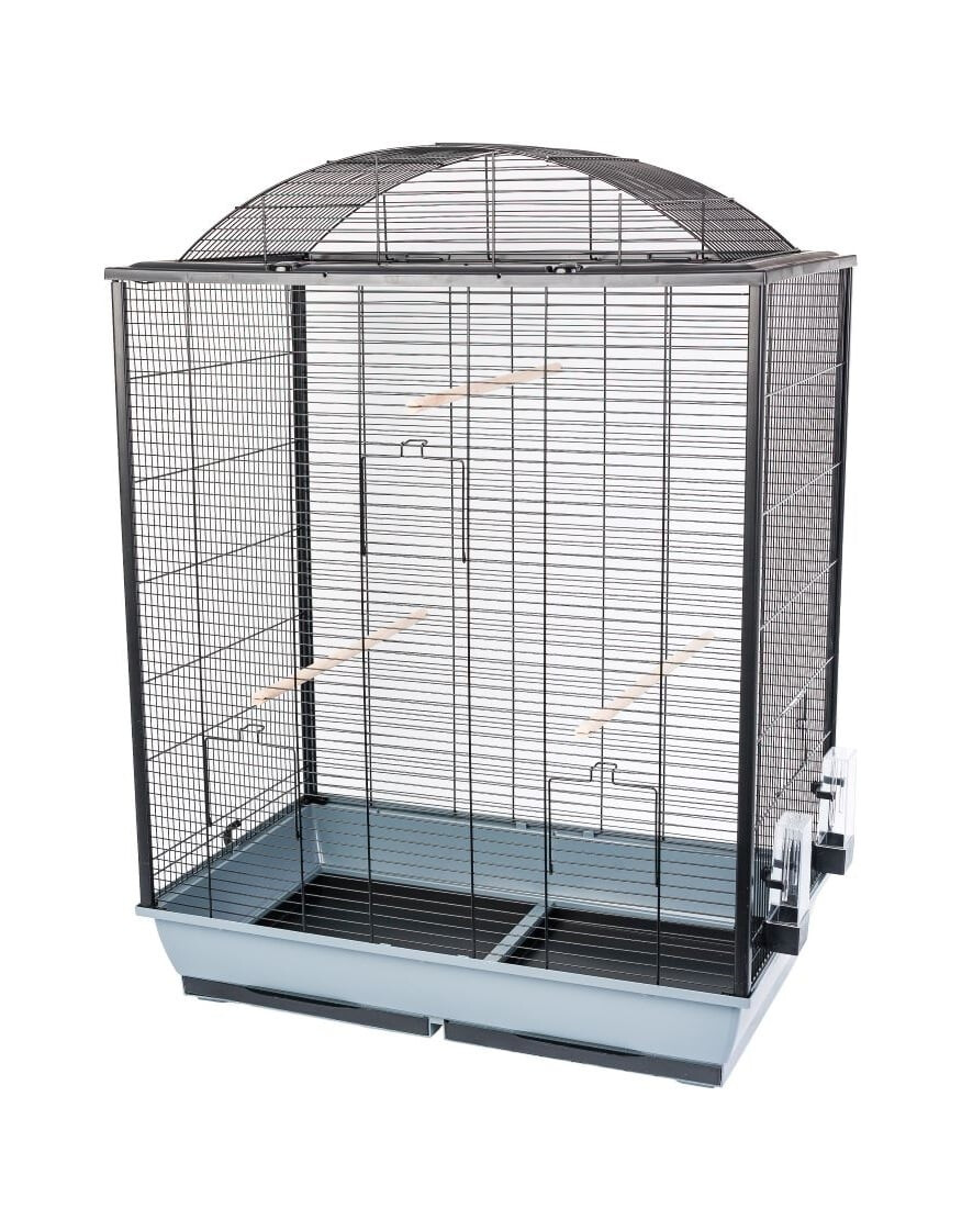 Großer Käfig mit abgerundetem Dach für Vögel. Ausgestattet mit großen Futterstellen und Sitzstangen, auf denen sich die Vögel ausruhen und spielen können. Die Sitzstangen bieten auch ein Element, an dem Spielzeug oder Zubehör für die Vögel befestigt werden kann.