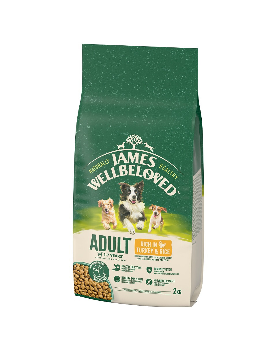 Die Rezeptur dieses Futters wurde sorgfältig entwickelt, um den Anforderungen erwachsener Hunde gerecht zu werden. Unser Futter mit Truthahn und Reis enthält natürliche Präbiotika zur Unterstützung einer gesunden Verdauung. Es enthält ausgewählte natürliche Zutaten ohne Zusatz von künstlichen Aromen, Farbstoffen oder Antioxidantien. James Wellbeloved Adult ist mit Vitaminen und Mineralstoffen angereichert, die Ihr Hund braucht, um glücklich, gesund und lebensfroh zu bleiben.