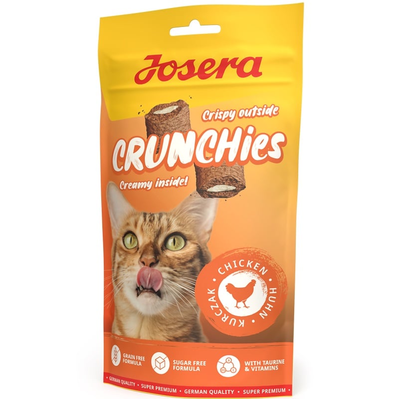 Wow, sind die knusprig! Die Snacks Josera Crunchies Chicken bieten noch viel mehr - denn sie sind gefüllt mit einer cremigen Füllung aus leckerem Hähnchen für hungrige Kätzchen! Diese getreidefreien und kalorienarmen Leckerlis sind der ideale Snack für jeden Tag.