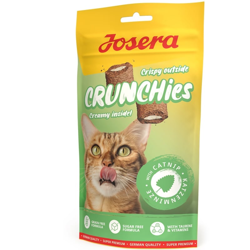 Die Snacks Josera Crunchies sind dank ihrer cremigen Füllung für Katzen sehr attraktiv. Und jetzt wurde Katzenminze hinzugefügt, was sie unwiderstehlich macht. Diese Snacks mit knuspriger Hülle und cremiger Füllung überzeugen auch die Katzenbesitzer, da sie wertvolle Vitamine, Taurin enthalten und gegen Haarballen wirken! Darüber hinaus ist das Rezept kalorienarm und enthält kein Getreide.